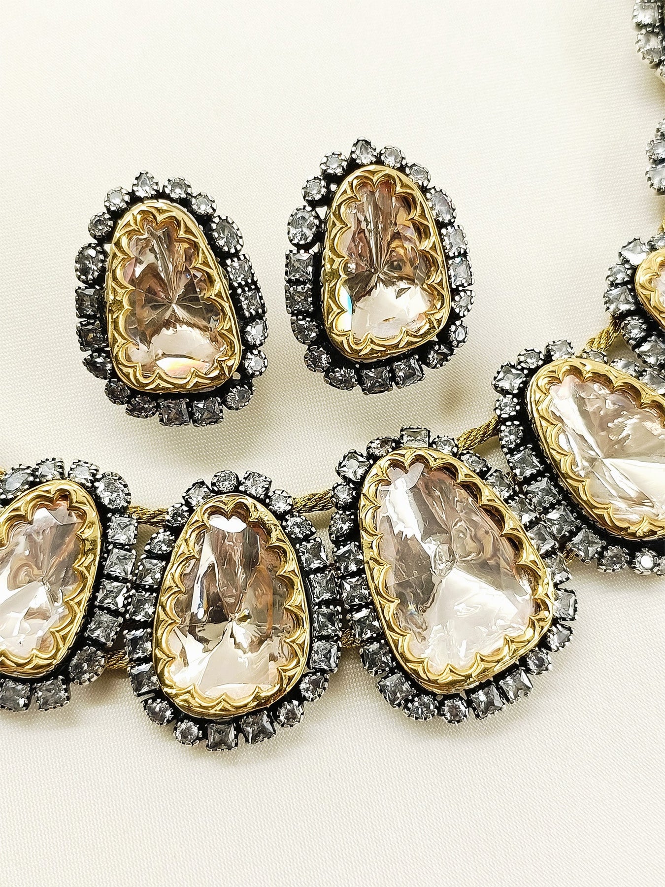 Crafted From Premium 92.5 Sterling Silver And Enhanced With Lustrous Gold Plating, This Moissanite Necklace Set Combines Elegance With Durability. Featuring Dazzling Moissanite Stones And Shimmering American Diamonds, It Offers Exceptional Brilliance And Sparkle. Perfect For Both Formal Occasions And Everyday Wear, This Set Ensures A Timeless Statement Of Sophistication And Style.