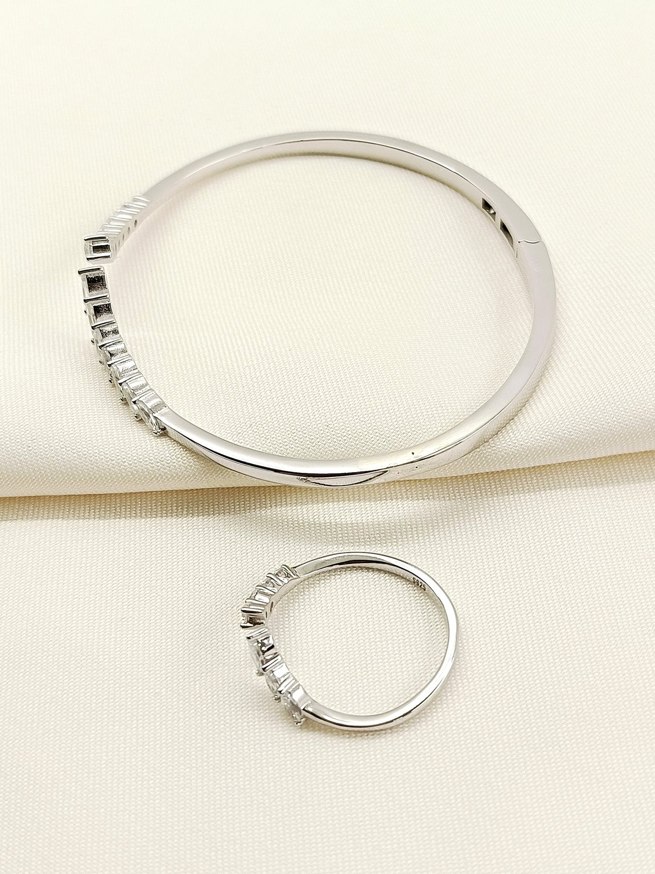 This Premium 92.5 Silver Bracelet Features Authentic Swarovski Stones Complemented By An Integrated Finger Ring Design. The Refined Silver-plated Finish Enhances The Brilliance Of The American Diamond Accents, Creating A Sophisticated Piece That Exemplifies Fine Craftsmanship. Perfect For Special Occasions Or As An Elegant Everyday Statement Piece That Captures Light With Exceptional Clarity.