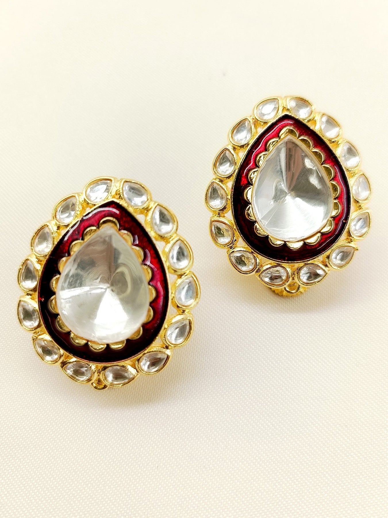 Discover the timeless sophistication of the Arissa Maroon Kundan Tops, a perfect blend of traditional craftsmanship and modern style. These earrings, made from gold-plated brass, feature a convenient clip-on back, ensuring both comfort and elegance. Whether you're attending a grand celebration or a casual outing, these Kundan Tops are your go-to accessory for a touch of luxury.