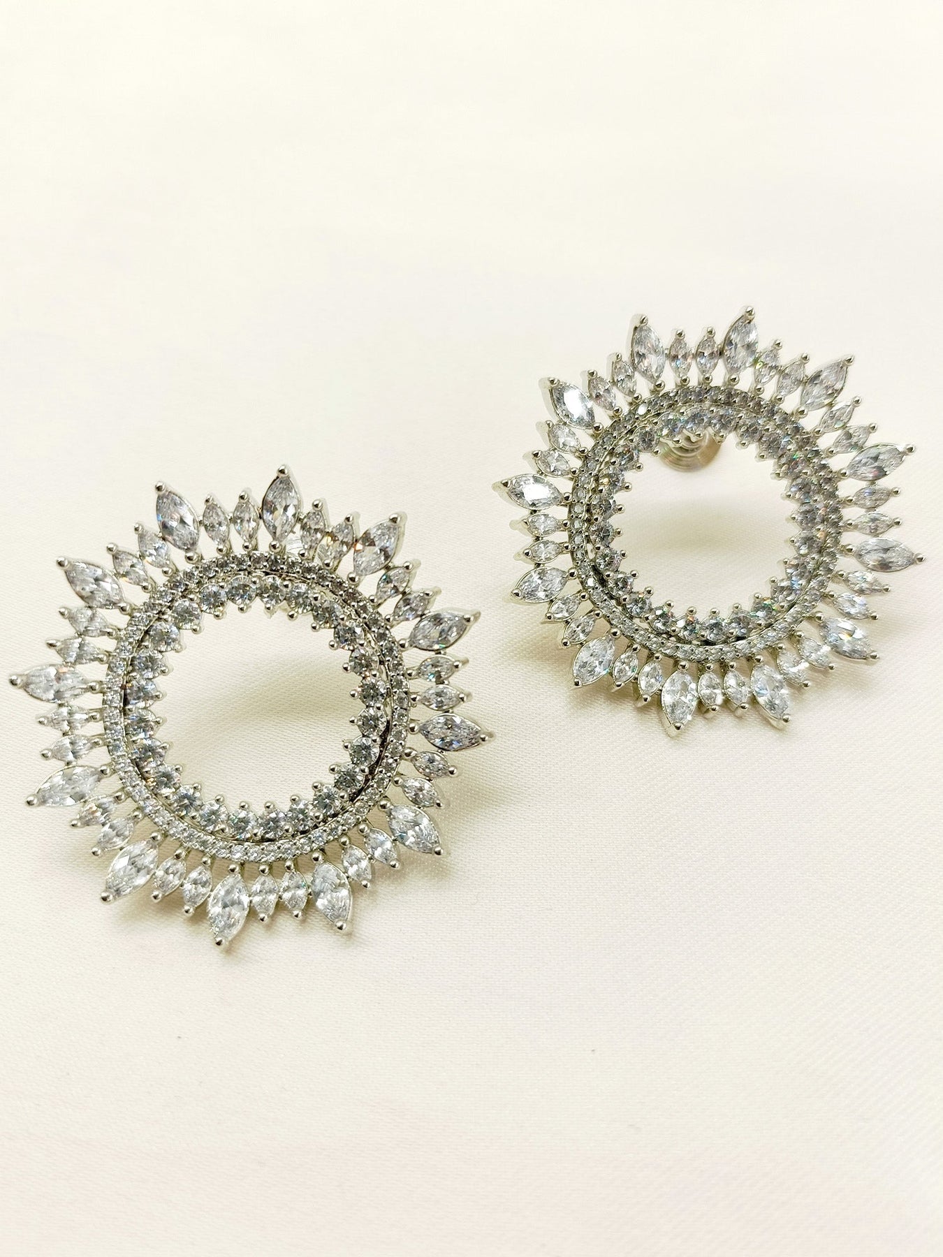 Perfect for any occasion, these earrings offer a blend of glamour and grace. Elevate your style and let your inner brilliance shine with this stunning jewelry piece. Discover the allure of the Dhruvika Diamond Work Silver Plated Tops and step into a spotlight of elegance.