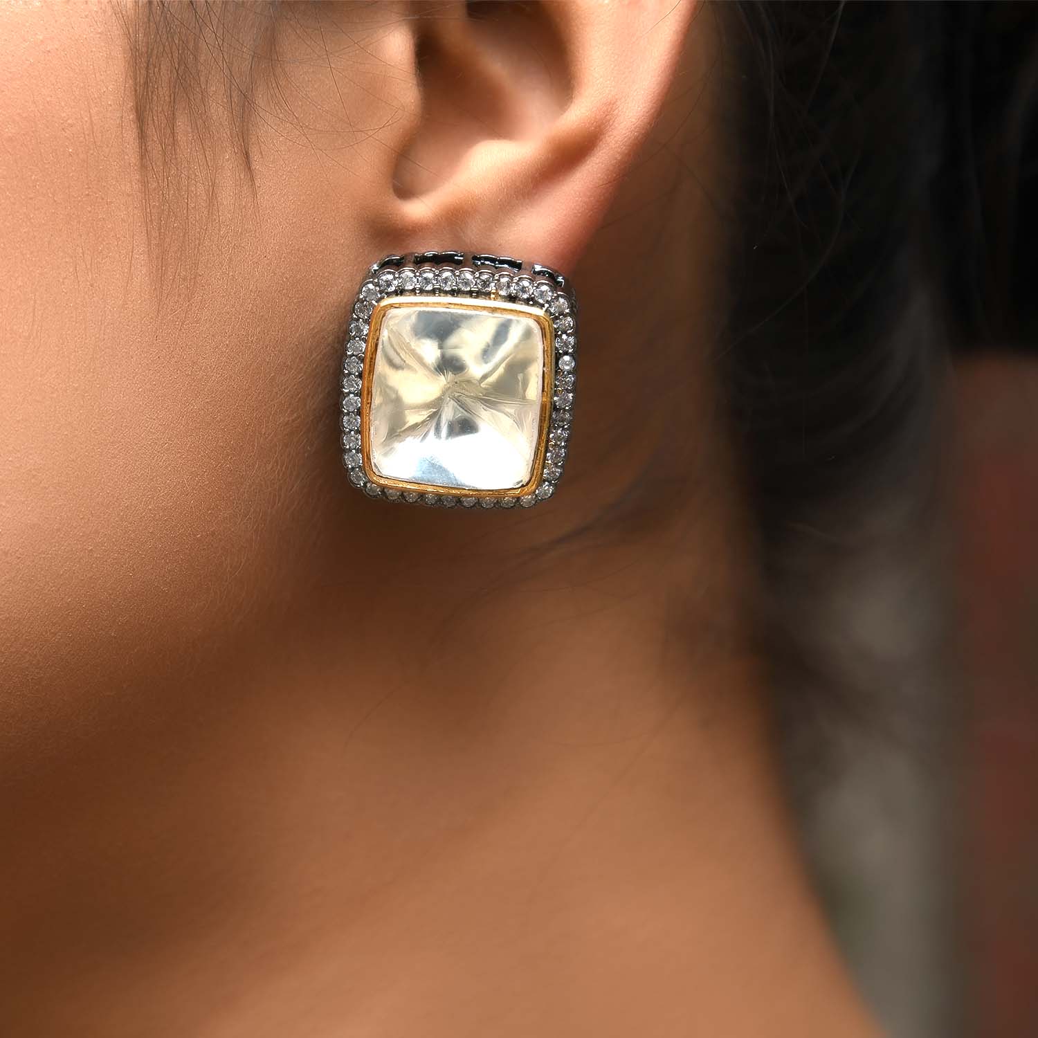 Beautiful Big Polki Stone And American Diamond Tops With Clip -On - Rhodium Plated Brass Metal With AD And Stones
