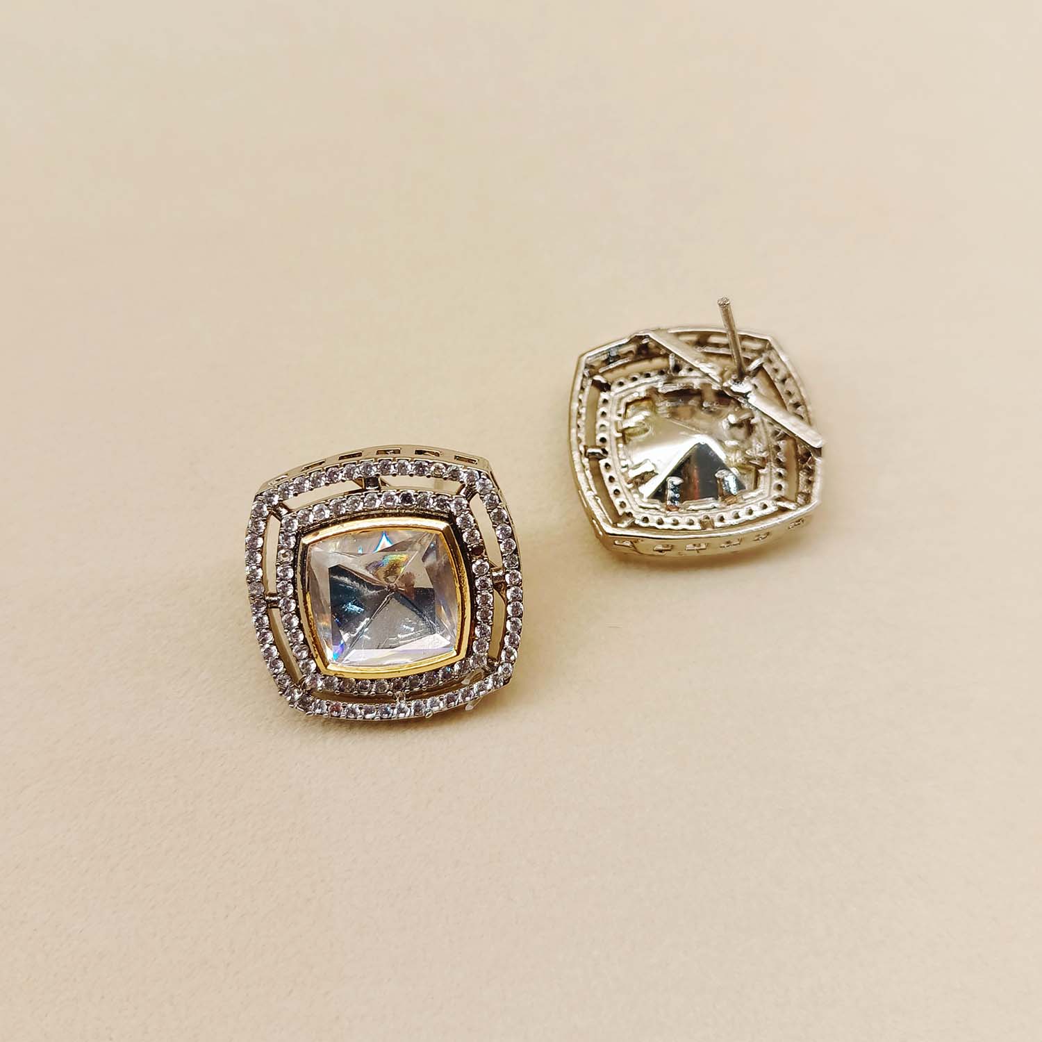 Discover the elegance and timeless beauty of the Jahnavi Diamond Polki Stone Gold And Silver Plated Kundan Tops. Crafted with precision, these earrings feature a stunning combination of large Polki stones and sparkling American diamonds. The intricate design is set in a blend of gold and silver-plated brass metal, offering a look that is as versatile as it is beautiful.