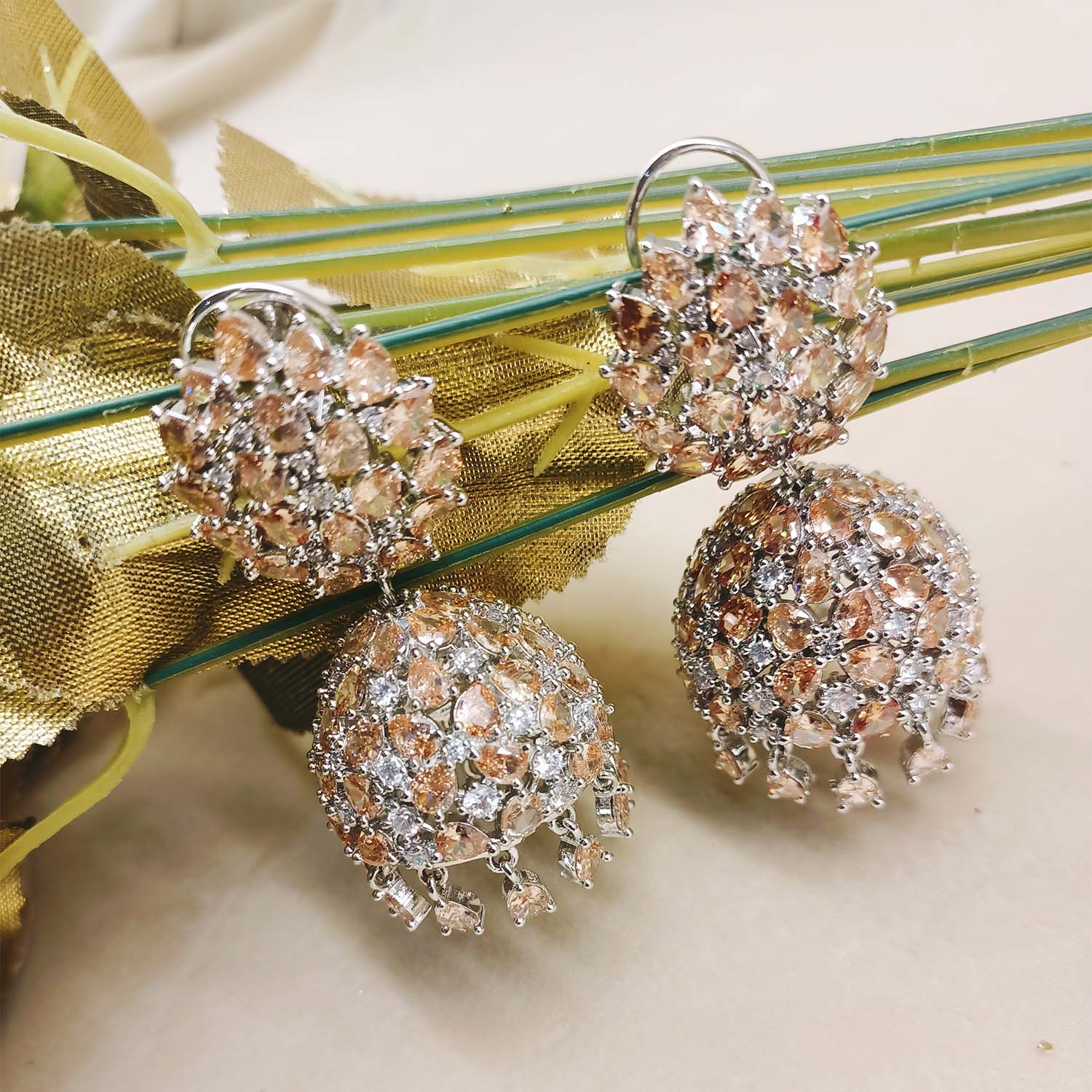 Make every occasion special with these stunning earrings that effortlessly blend beauty and craftsmanship. Whether you're attending a festive celebration or a casual gathering, these jhumkis will make you shine with confidence and grace. Elevate your style and make a statement wherever you go with the Jharna Copper Silver Plated American Diamond Jhumki.