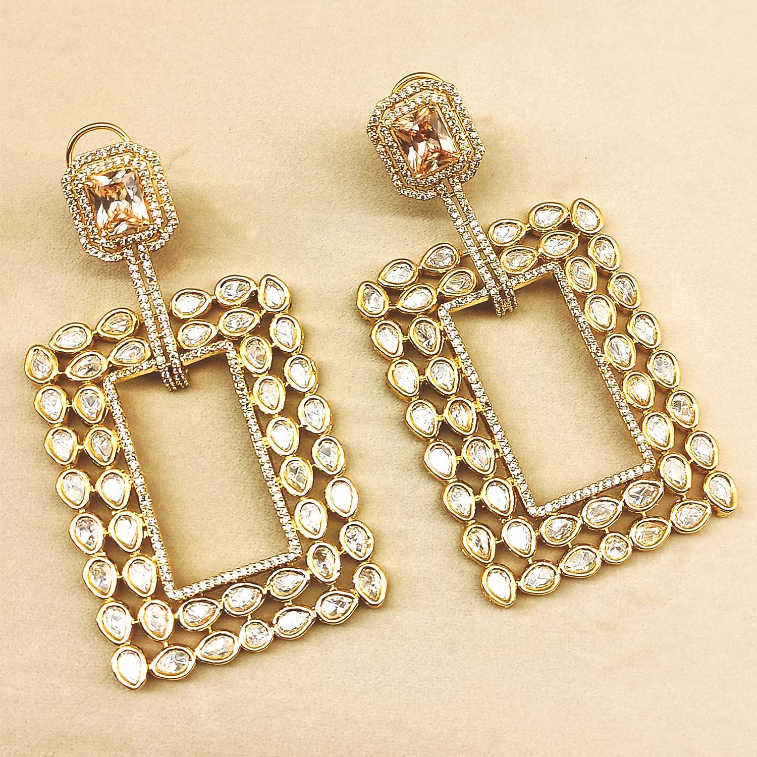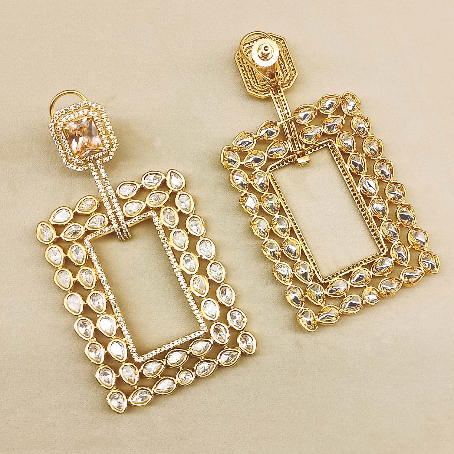 Crafted with meticulous attention to detail, each piece features stunning American diamonds and exquisite Kundan-polki work. The earrings are set in gold-plated brass metal, ensuring a radiant and luxurious finish that complements any outfit.