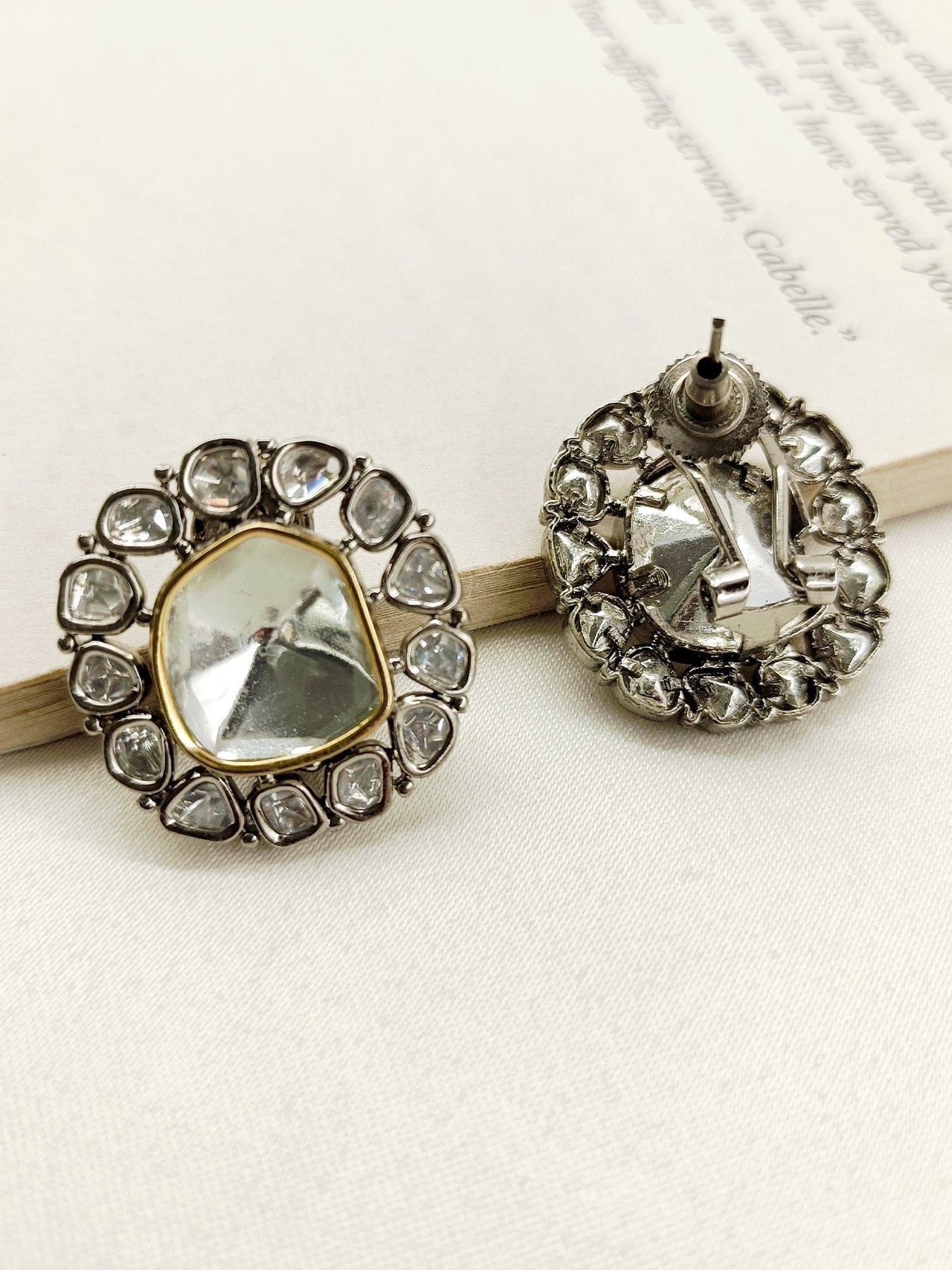 Discover the elegance of Maithily Diamond Work Rhodium Plated Victorian Tops, a stunning accessory designed to elevate your style. These exquisite earrings feature a harmonious blend of silver and gold tones, accentuated by the brilliance of uncut Polki diamonds. Crafted with precision, they embody timeless beauty and sophistication.