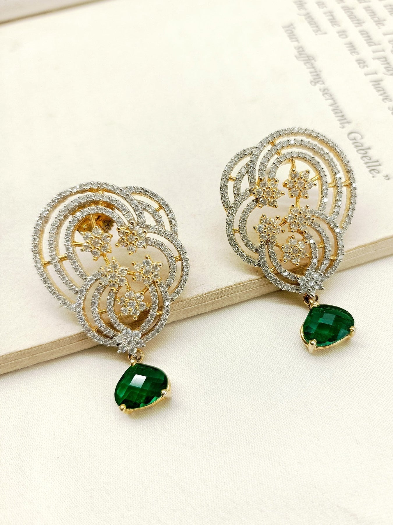 Crafted with precision, these earrings feature a stunning gold plating that beautifully complements the brilliance of American diamonds. The addition of a vibrant green stone adds a touch of uniqueness, capturing attention and admiration wherever you go.