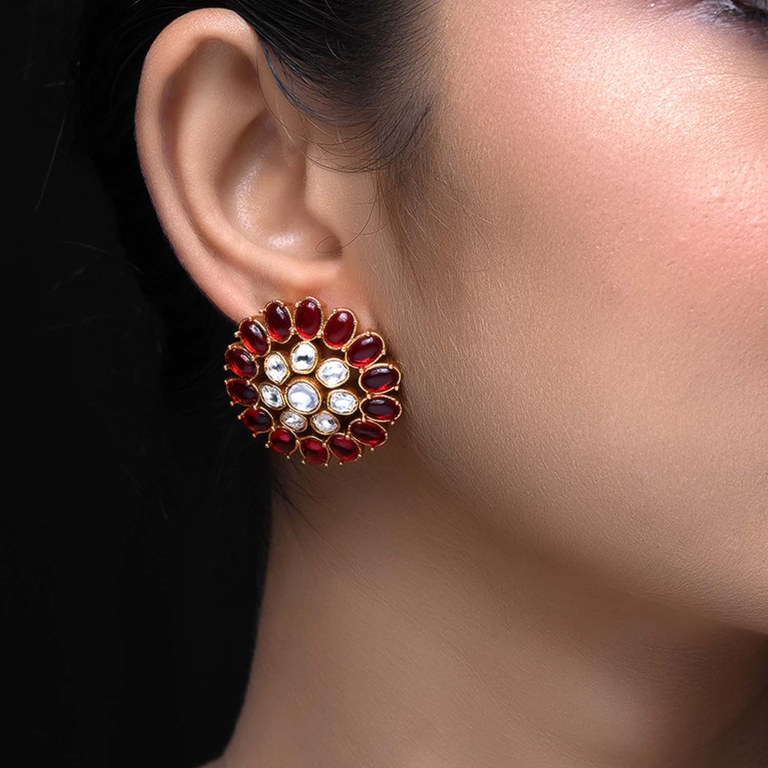 Stunning Kundan and colored stone tops in maroon with gold plated brass metal