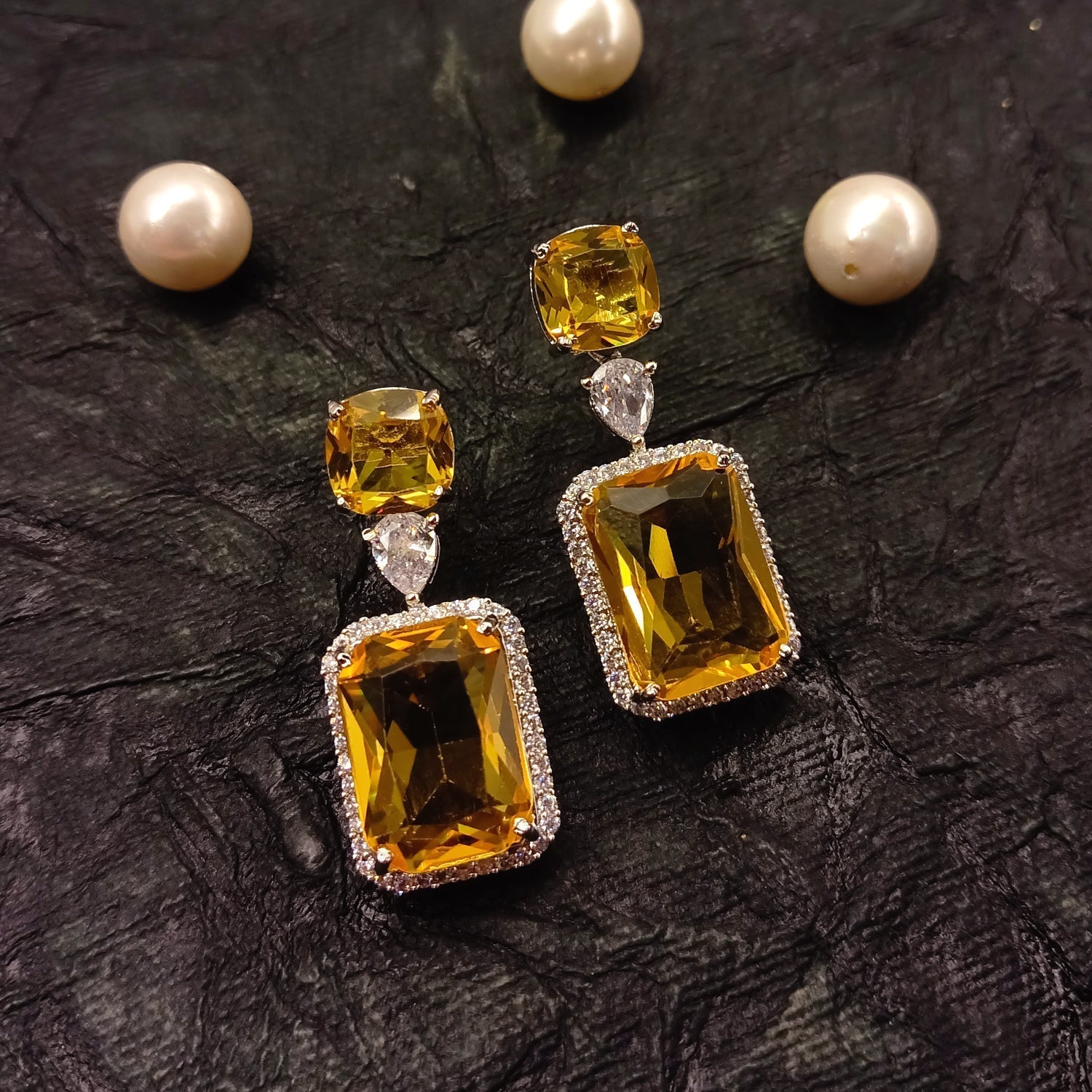 Set in high-quality, silver-plated brass, these earrings feature a captivating yellow stone that enhances their charm and allure. Whether you're dressing up for a special occasion or simply want to brighten your everyday look, these earrings are designed to inspire and empower your personal style.