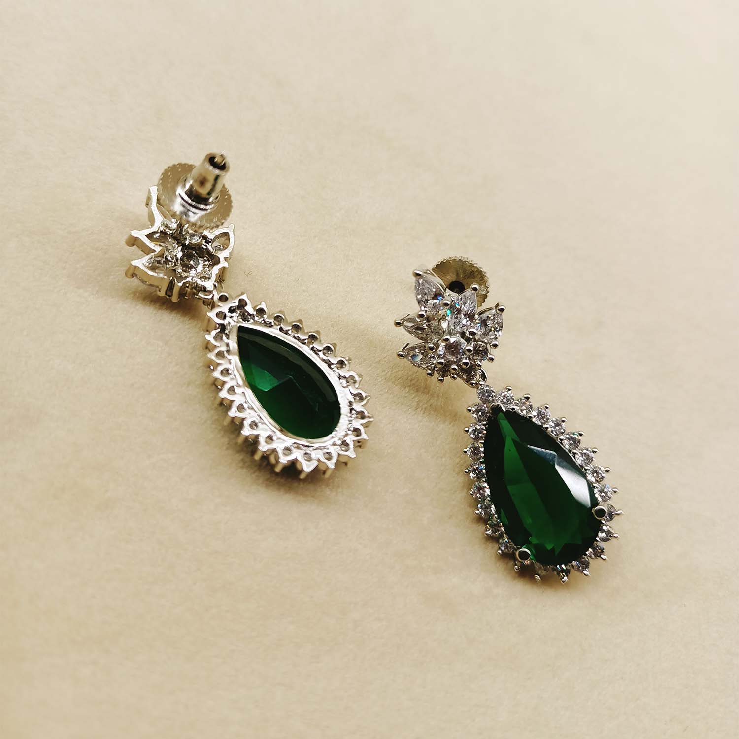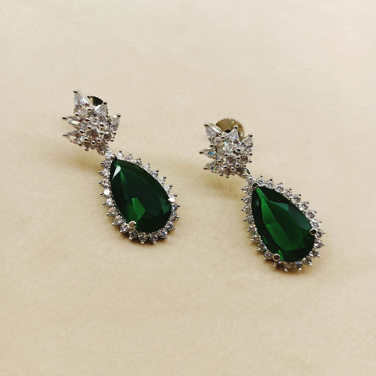 American Diamond With Fancy Cut Shape Diamond Earrings With Green Colour With Silver Plating