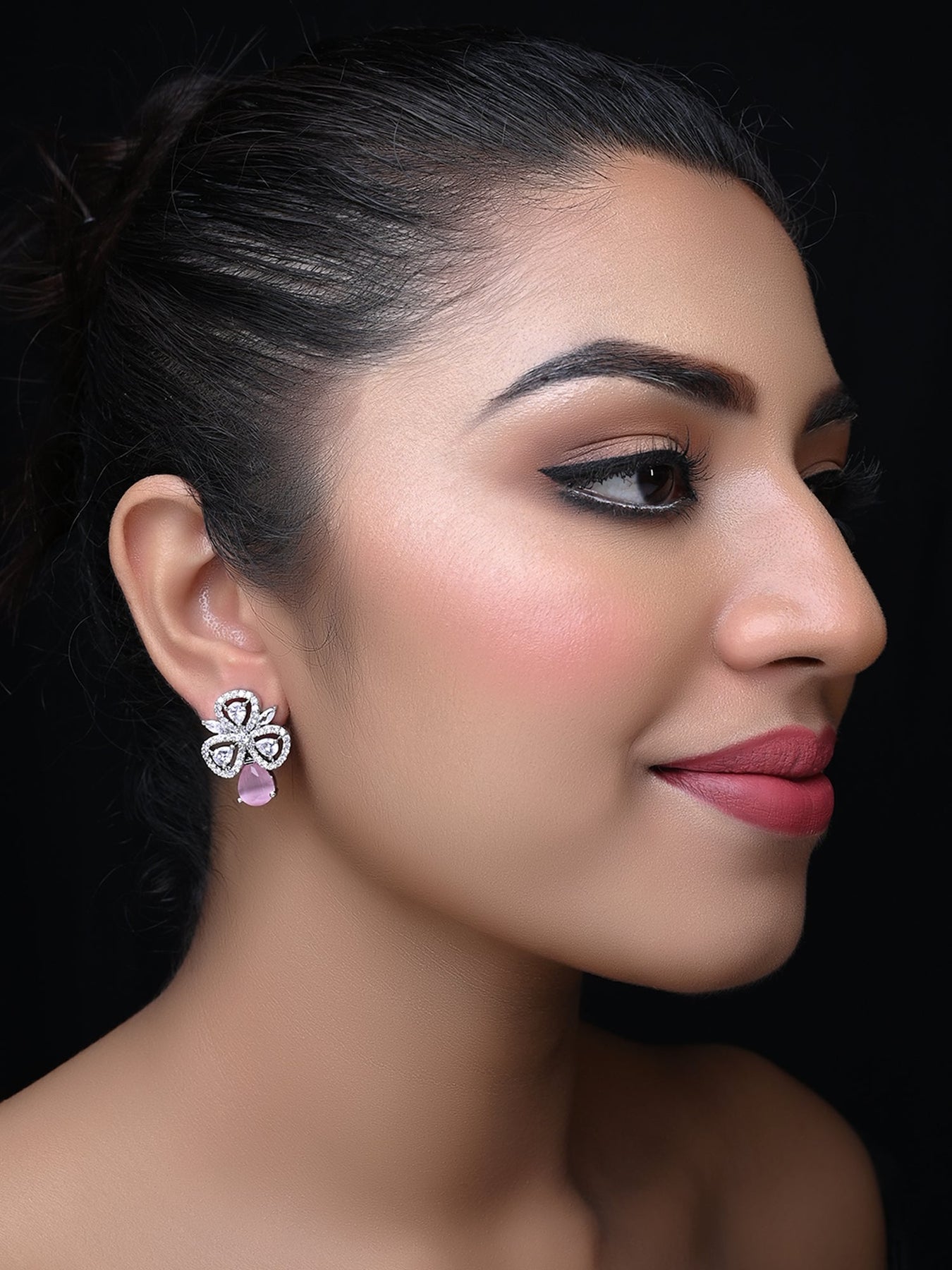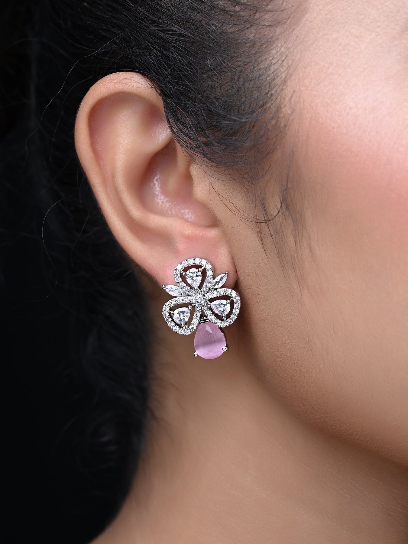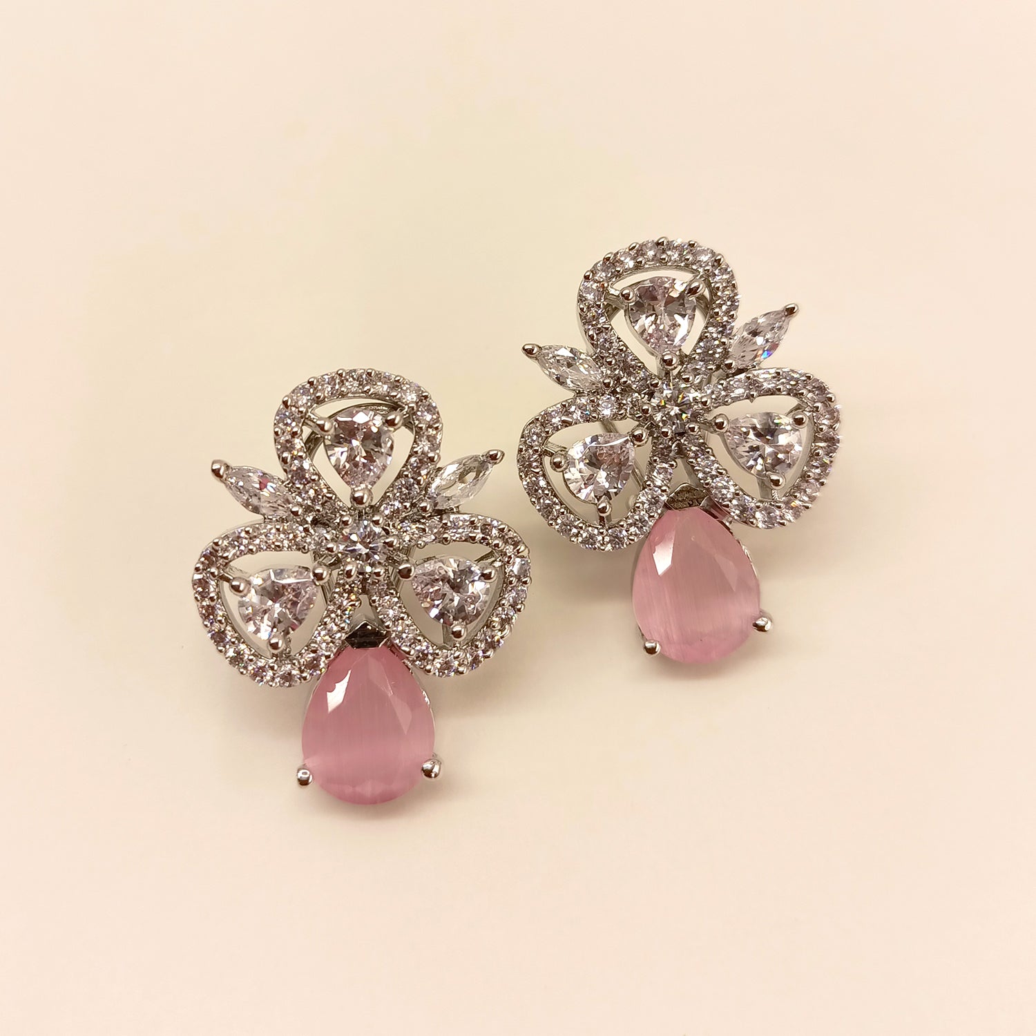 Trendy American Diamond Tops (studs) With Semi Precious Baby Pink (aqua) Stone. Brass Metal Silver Plated