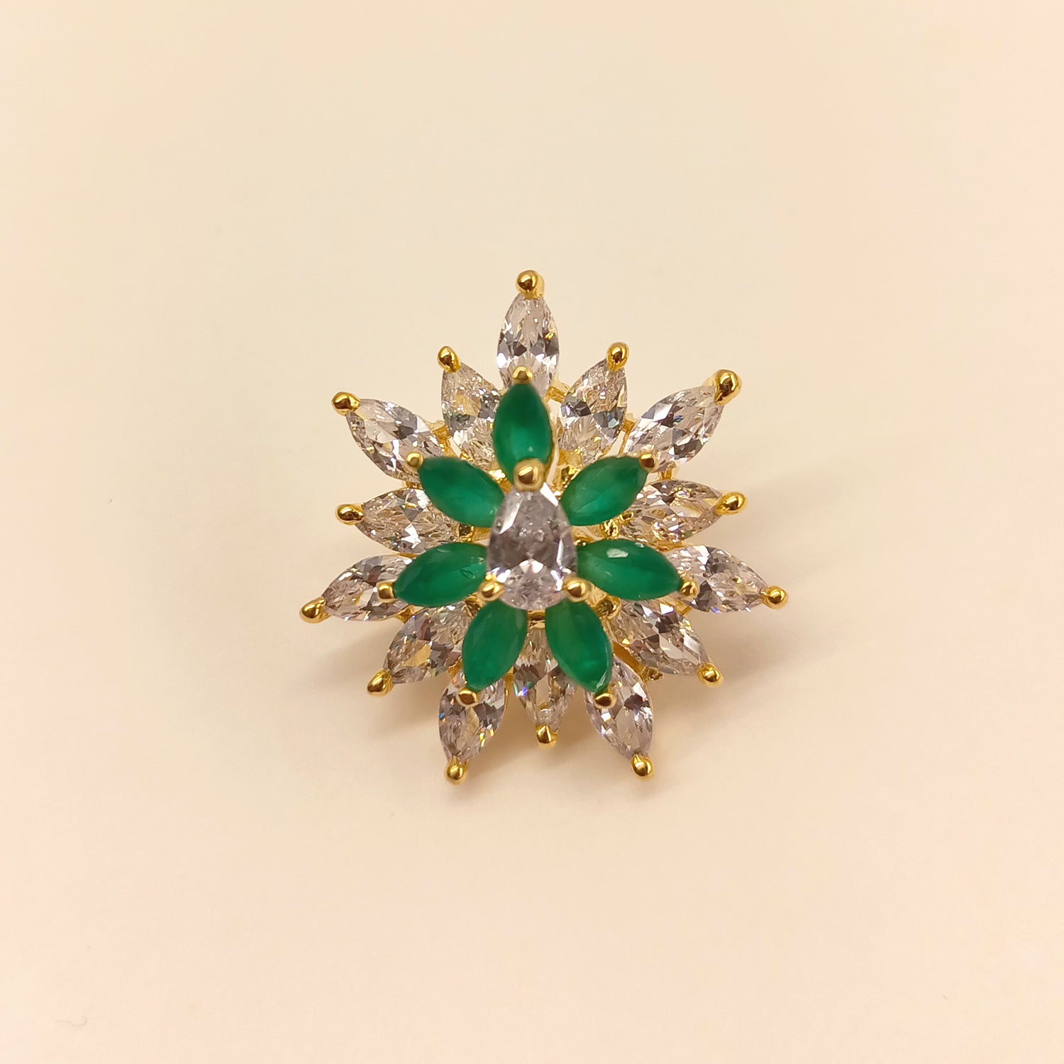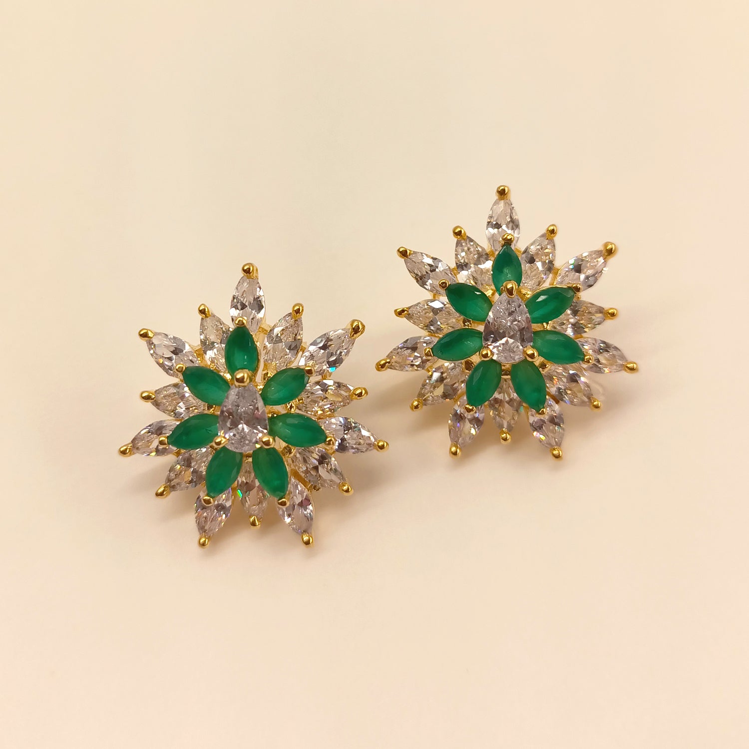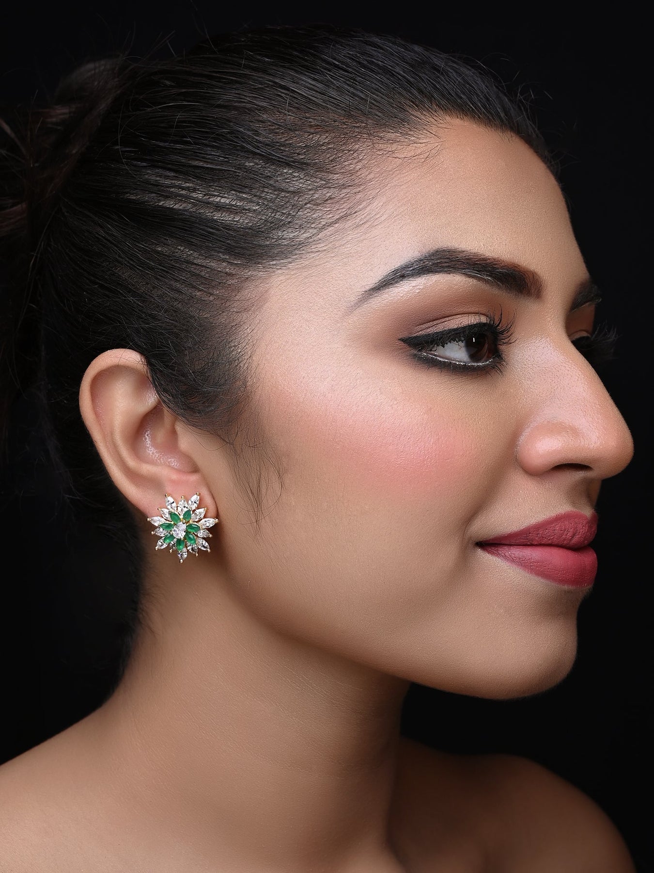 Enhance your elegance with the exquisite "Ruchita American Diamond Green Emerald Tops." These stunning studs combine modern style with classic charm, featuring semi-precious green emerald stones that add a touch of sophistication to any outfit.