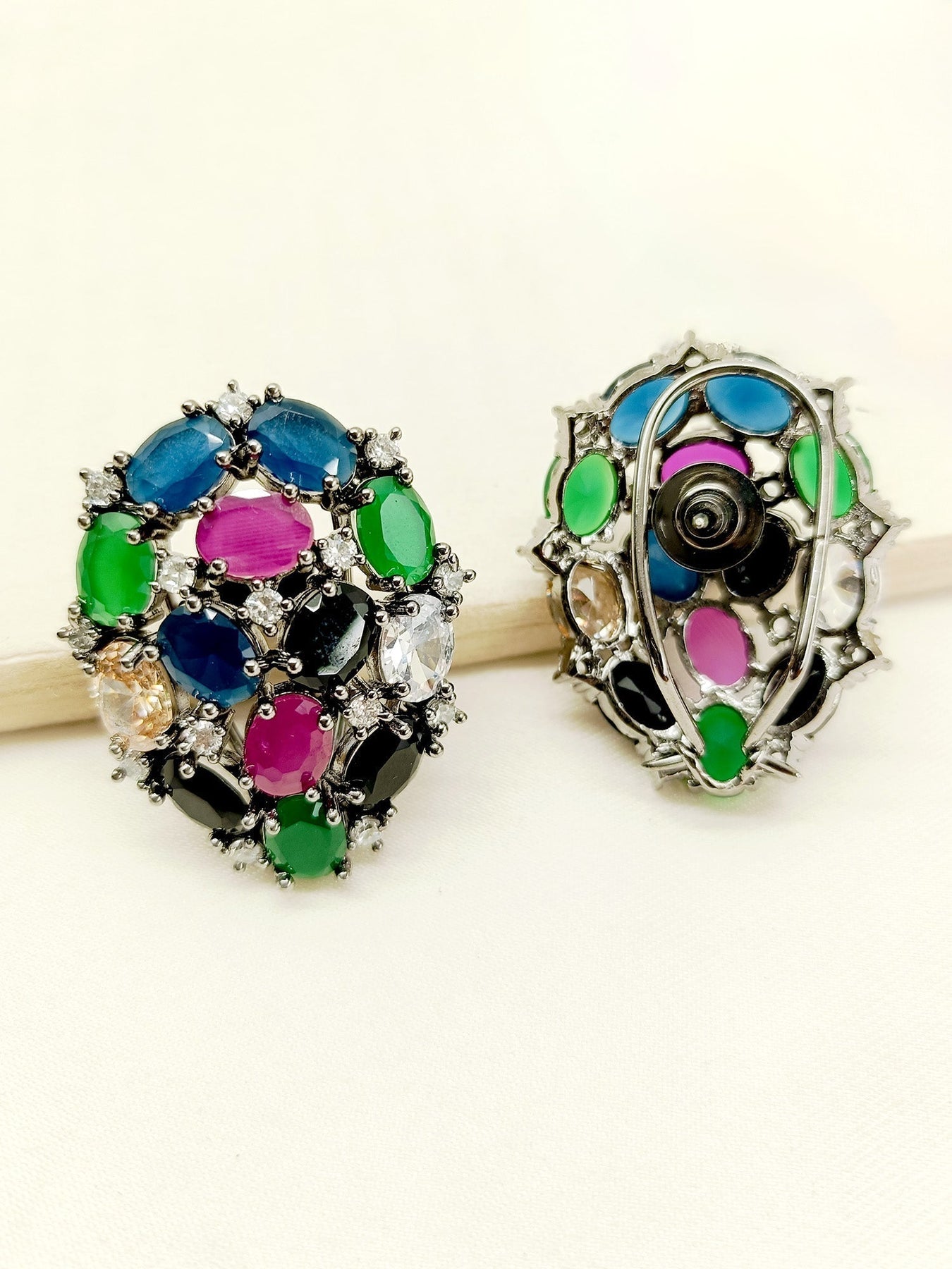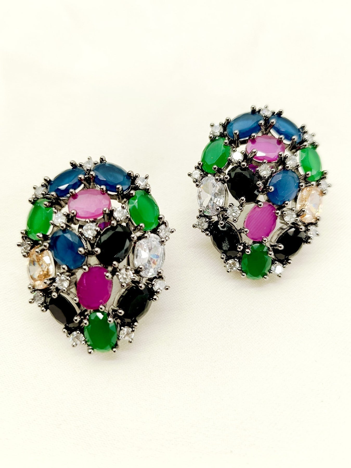 Bring a splash of color and timeless style into your life with the Safia Multi Colour Victorian Tops. Crafted with precision from rhodium-plated brass, these earrings embody elegance and charm. Each piece is adorned with exquisite American Diamond stones, transforming any ensemble into a luxurious statement.