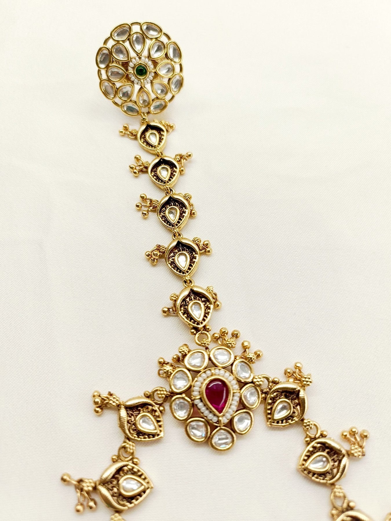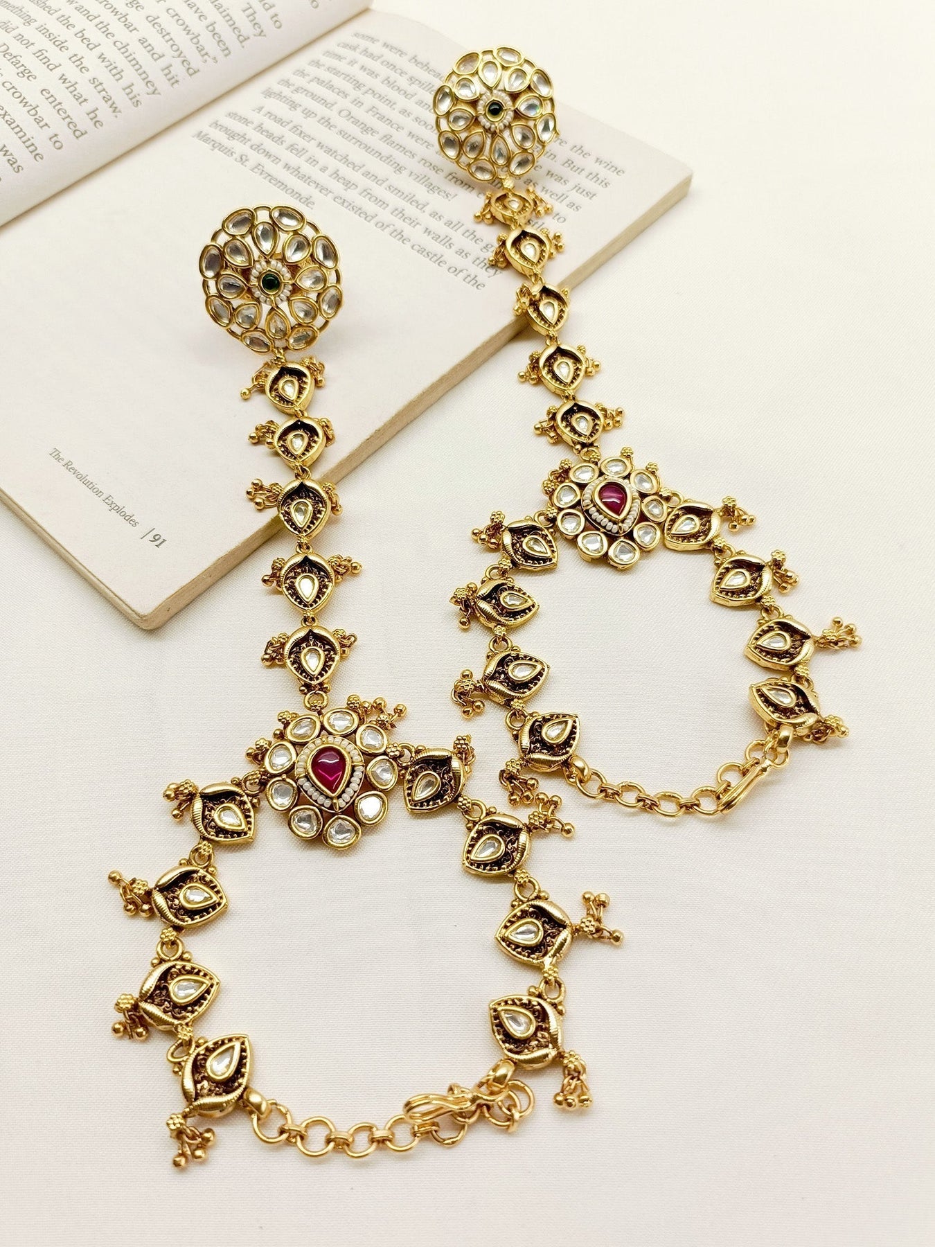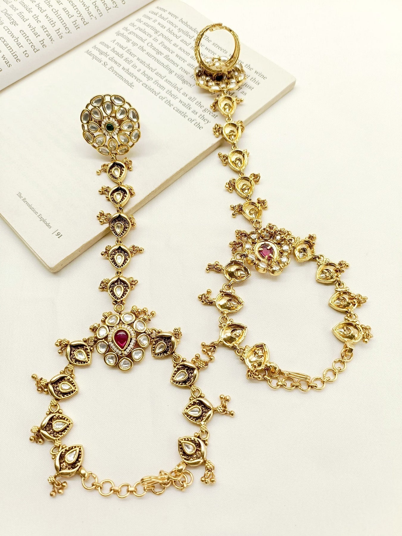 This Sophisticated Antique Hathphool Set Features A Traditional Style Completed With Exquisite Kundan, Gold Plated Brass Metal With An Adjustable Chain For A Secure And Comfortable Fit. Enhance Your Ethnic Look With This Elegant Set.