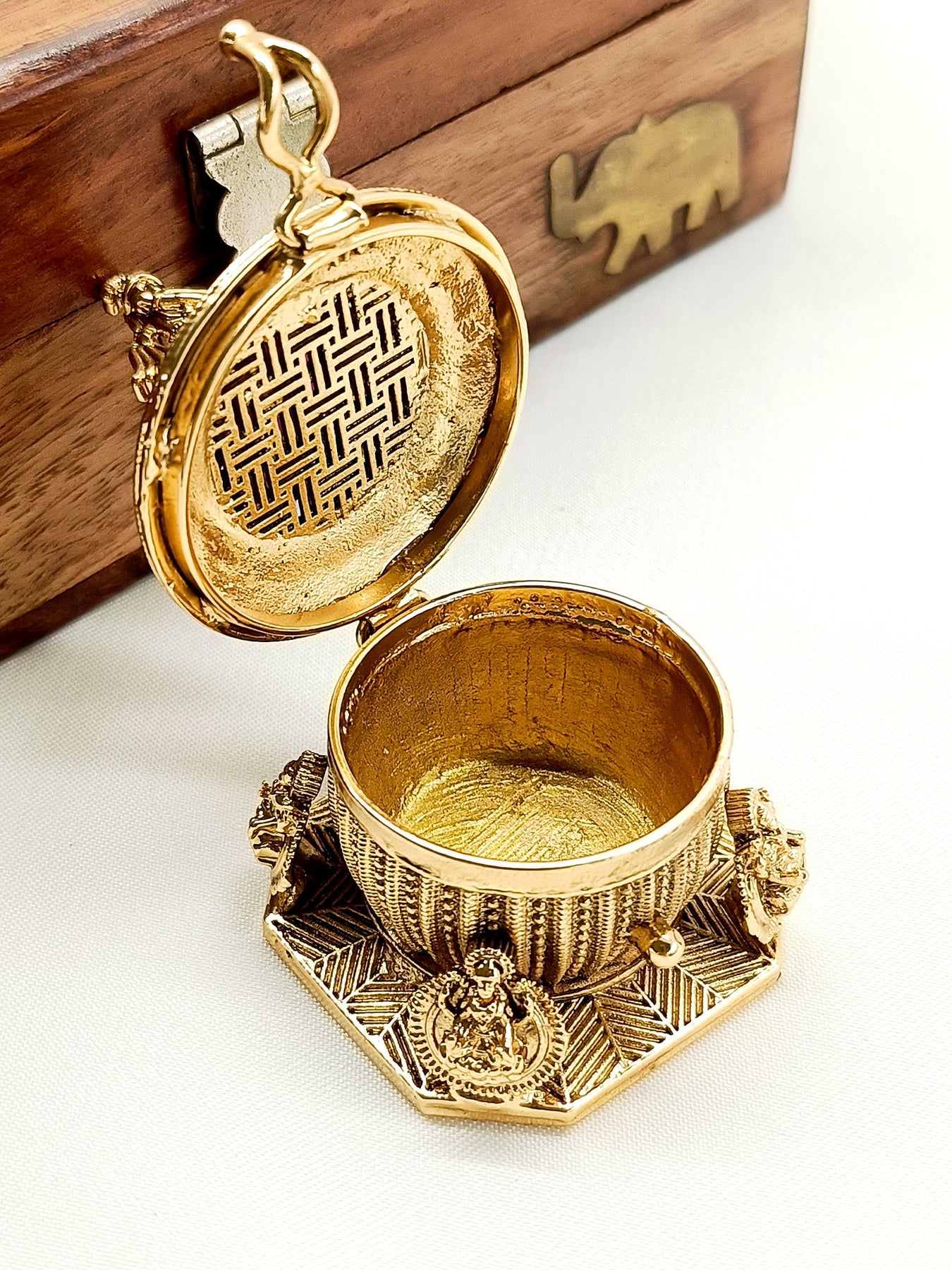 This Traditional Sindoor Dibbi Is Crafted From Gold Plated Brass Metal And Is Adorned With Intricate Temple Motifs. It Is A Must-have For Any Cultural Or Religious Occasion. Its Elegant Design Adds A Touch Of Sophistication To Any Outfit. Made With Expert Craftsmanship, It Is A Beautiful And Meaningful Piece To Add To Your Collection. "Elevate your experience with Qivii: Where customer satisfaction, swift delivery, and guaranteed quality converge."