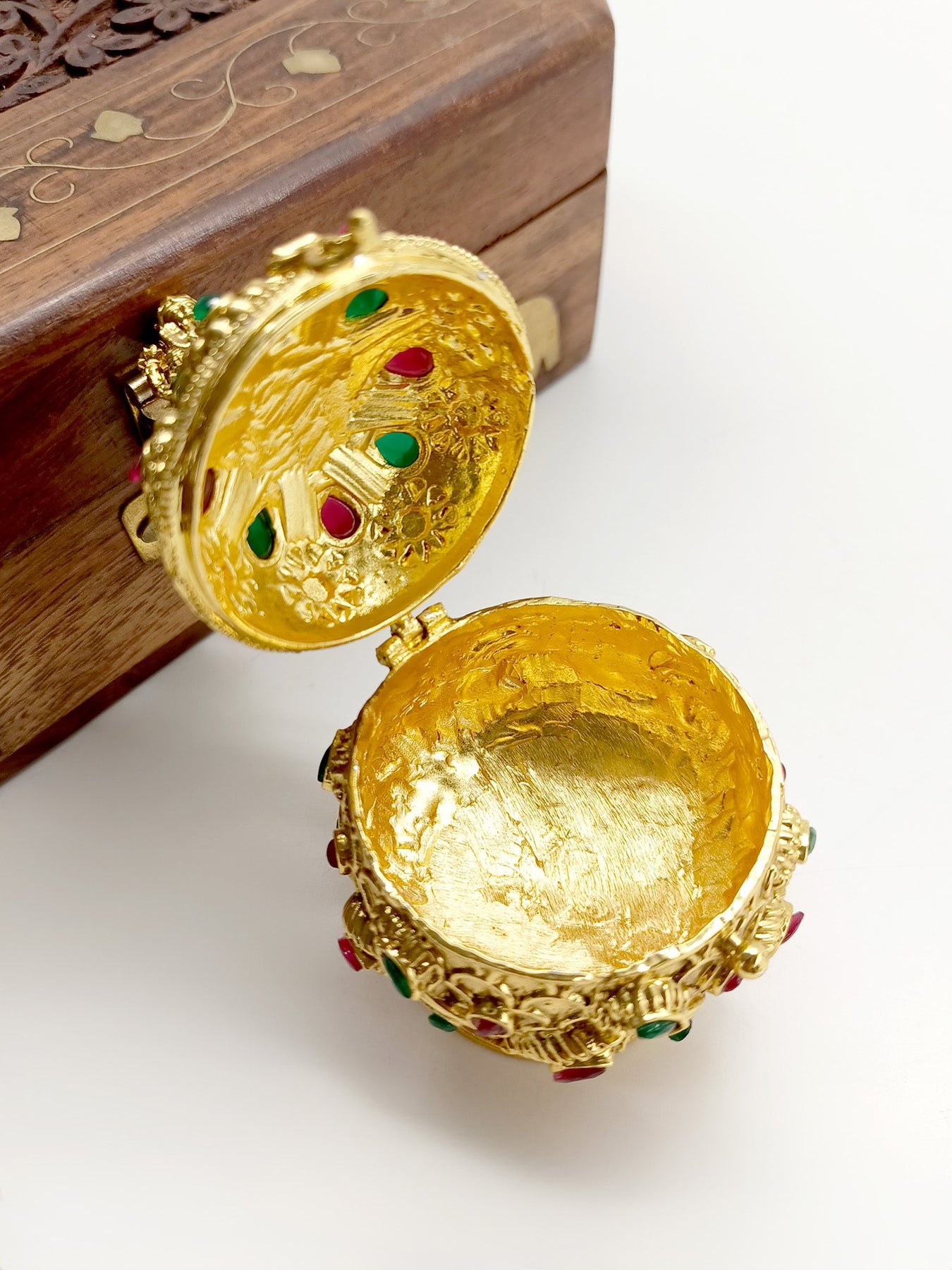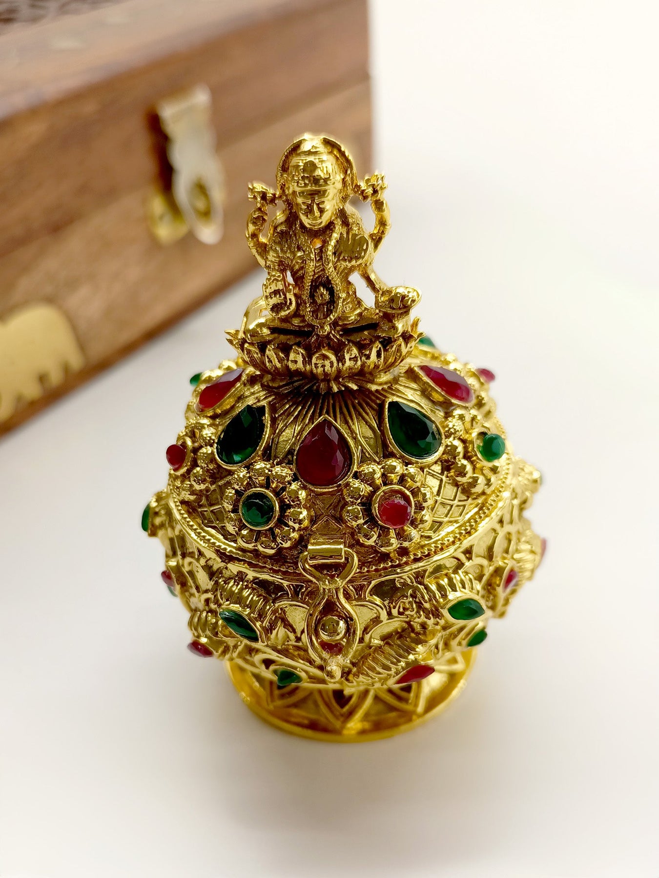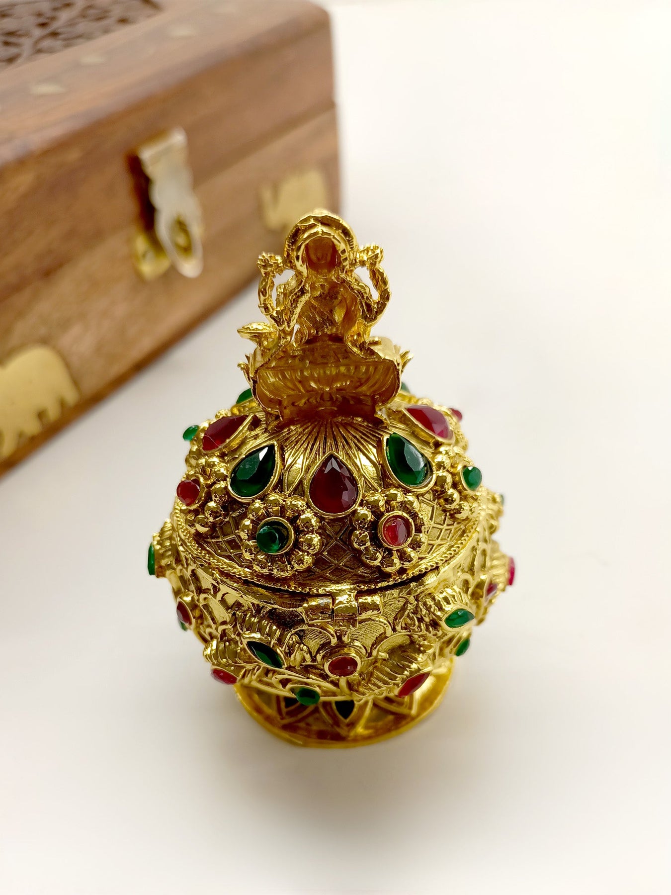 This Traditional Sindoor Dibbi Is Crafted From Gold Plated Brass Metal And Is Adorned With Intricate Temple Motifs. It Is A Must-have For Any Cultural Or Religious Occasion. Its Elegant Design Adds A Touch Of Sophistication To Any Outfit. Made With Expert Craftsmanship, It Is A Beautiful And Meaningful Piece To Add To Your Collection. "Elevate your experience with Qivii: Where customer satisfaction, swift delivery, and guaranteed quality converge."