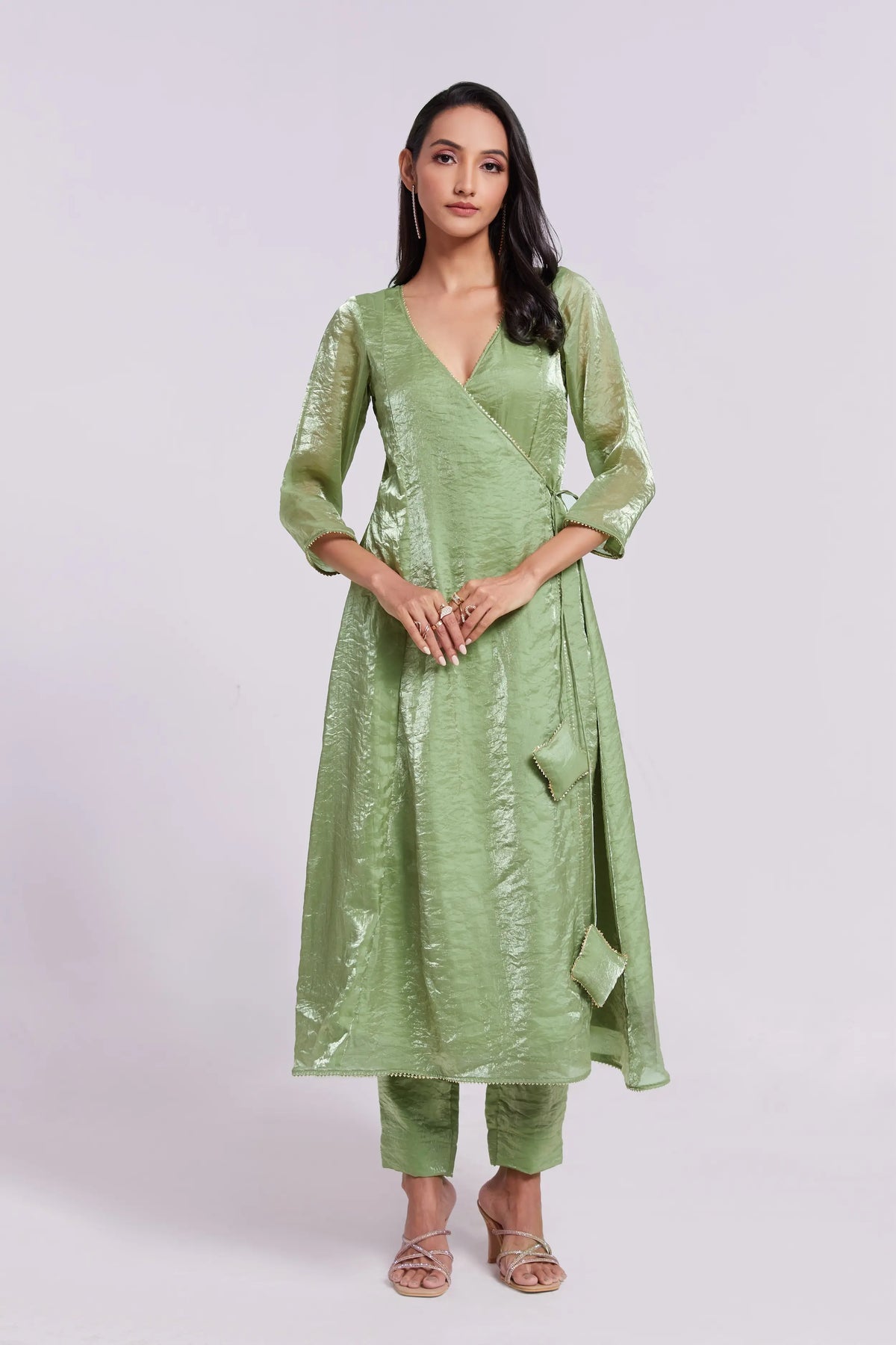 Celebrate the upcoming festival season with our beautiful Pista Green Organza Salwar Suit. The set includes a stylish kurta with matching trousers. Ready to wear, it’s the perfect choice for festive occasions, offering both elegance and comfort.