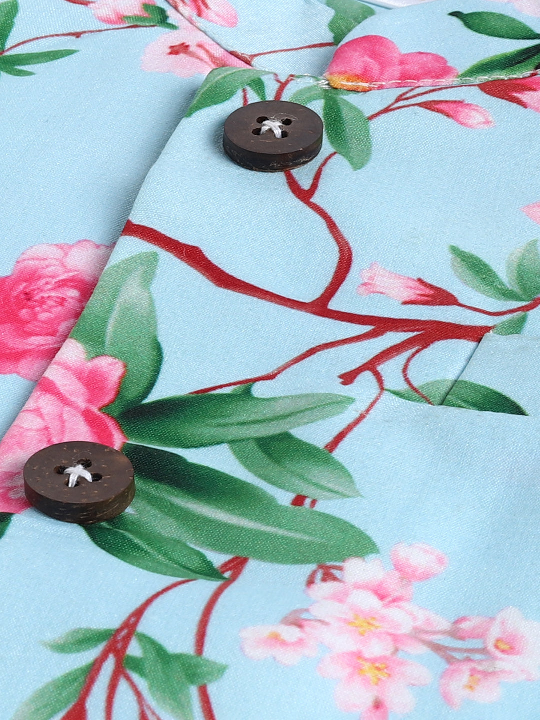 Aqua blue floral printed Nehru jacket, has a mandarin collar, a full button placket, sleeveless, a welt pocket.