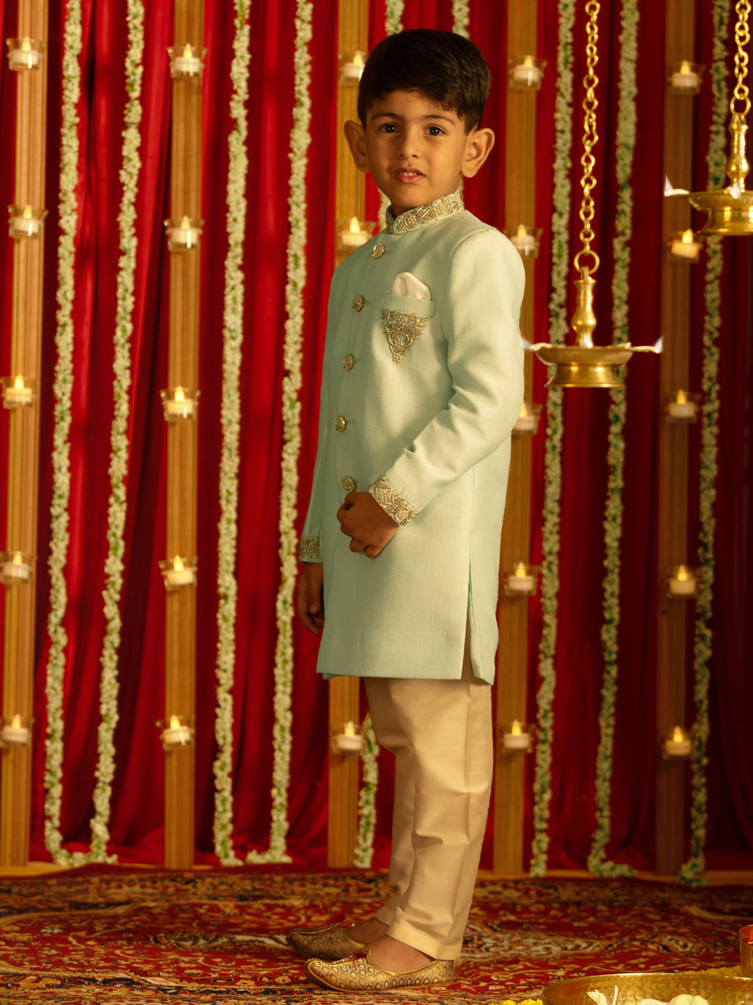 VASTRAMAY Boys' Aqua Silk Blend Solid Sherwani Set