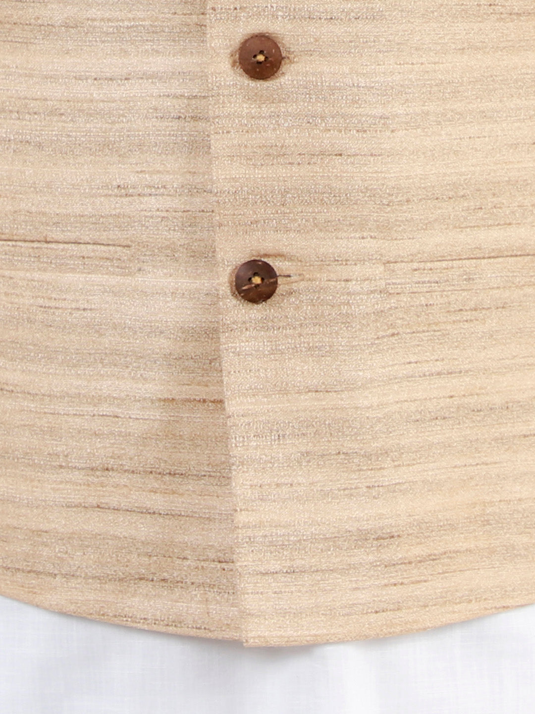 Beige woven Nehru jacket, has a mandarin collar, a full wooden button placket, sleeveless, three pockets