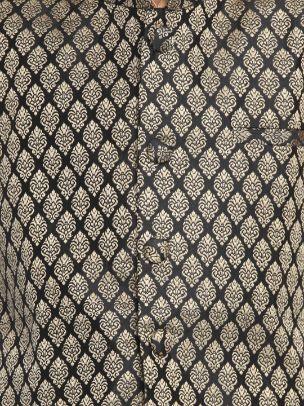 Black and Beige Nehru jacket, has mandarin collar, sleeveless, button closure