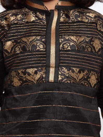 Black and gold woven floral kurta with Pyjamas have a mandarin collar, Regular style, long sleeves, Straight shape, knee-length with a straight hem, 2 pockets.