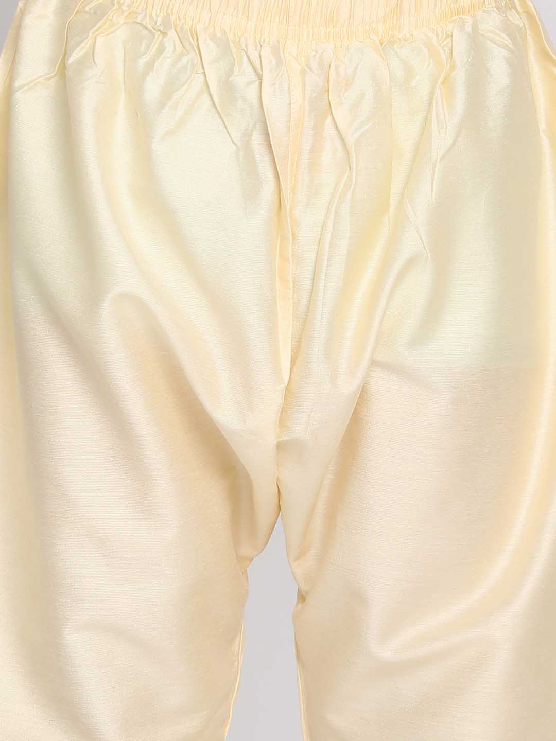 Black woven jacket, has a mandarin collar, long sleeves, full button placket, asymmetric hemline, side slits, a welt pocket and pocket square. Comes with cream color long sleeves knee length solid kurta, has mandarin collar, straight hem and side slits. Cream color solid pyjama, has elasticated waistband