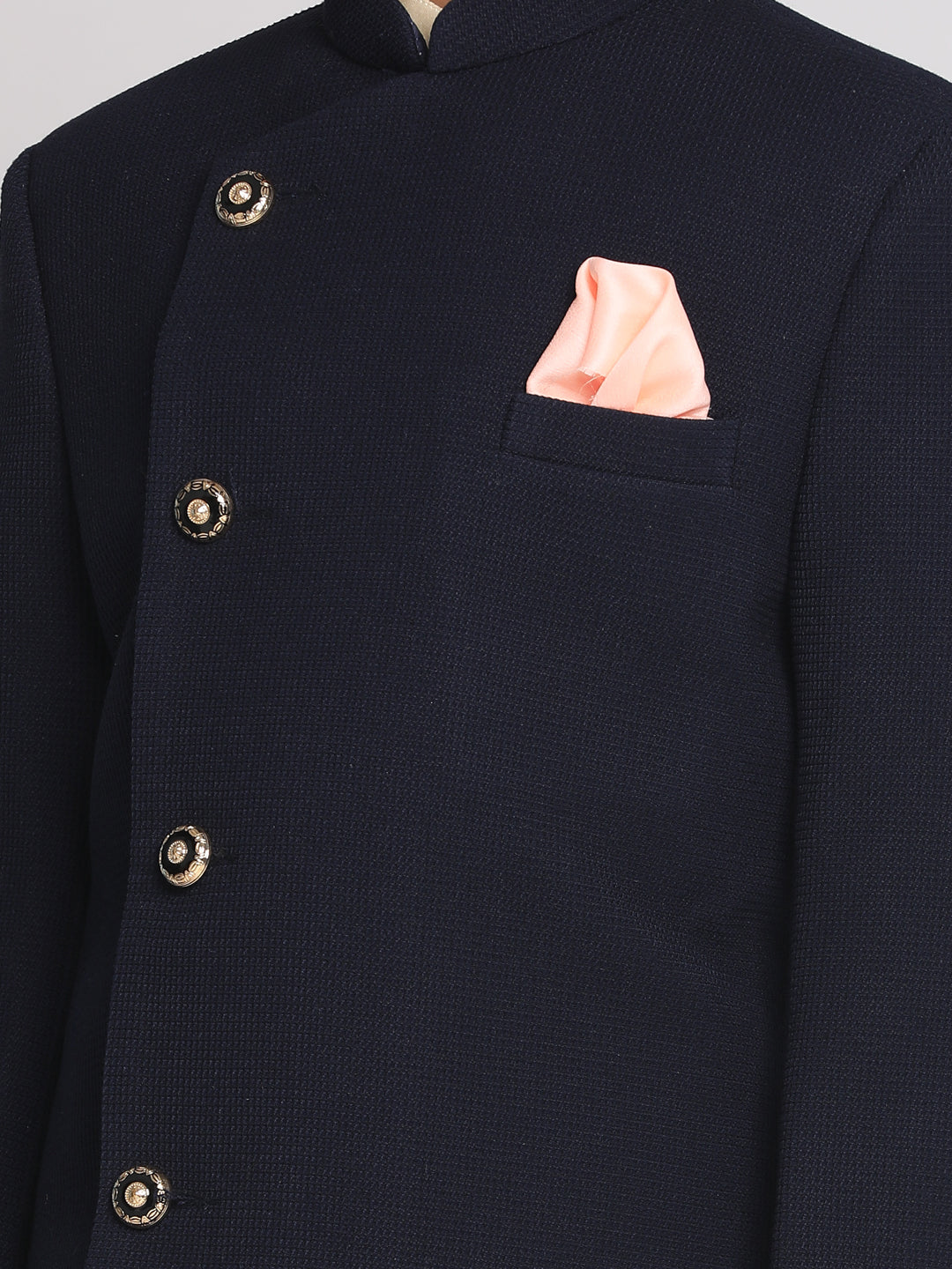 Blue woven jacket, has a mandarin collar, long sleeves, full button placket, asymmetric hemline, side slits, a welt pocket and pocket square. Comes with cream color long sleeves knee length solid kurta, has mandarin collar, straight hem and side slits. Cream color solid pyjama, has elasticated waistband