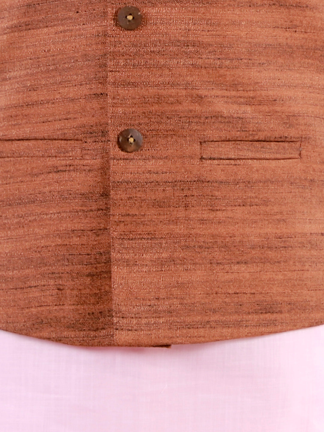 Coffee brown woven Nehru jacket, has a mandarin collar, a full wooden button placket, sleeveless, three pockets