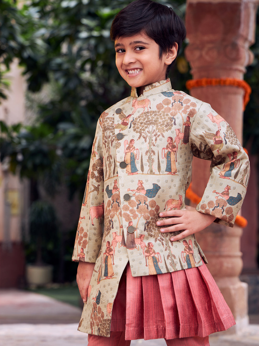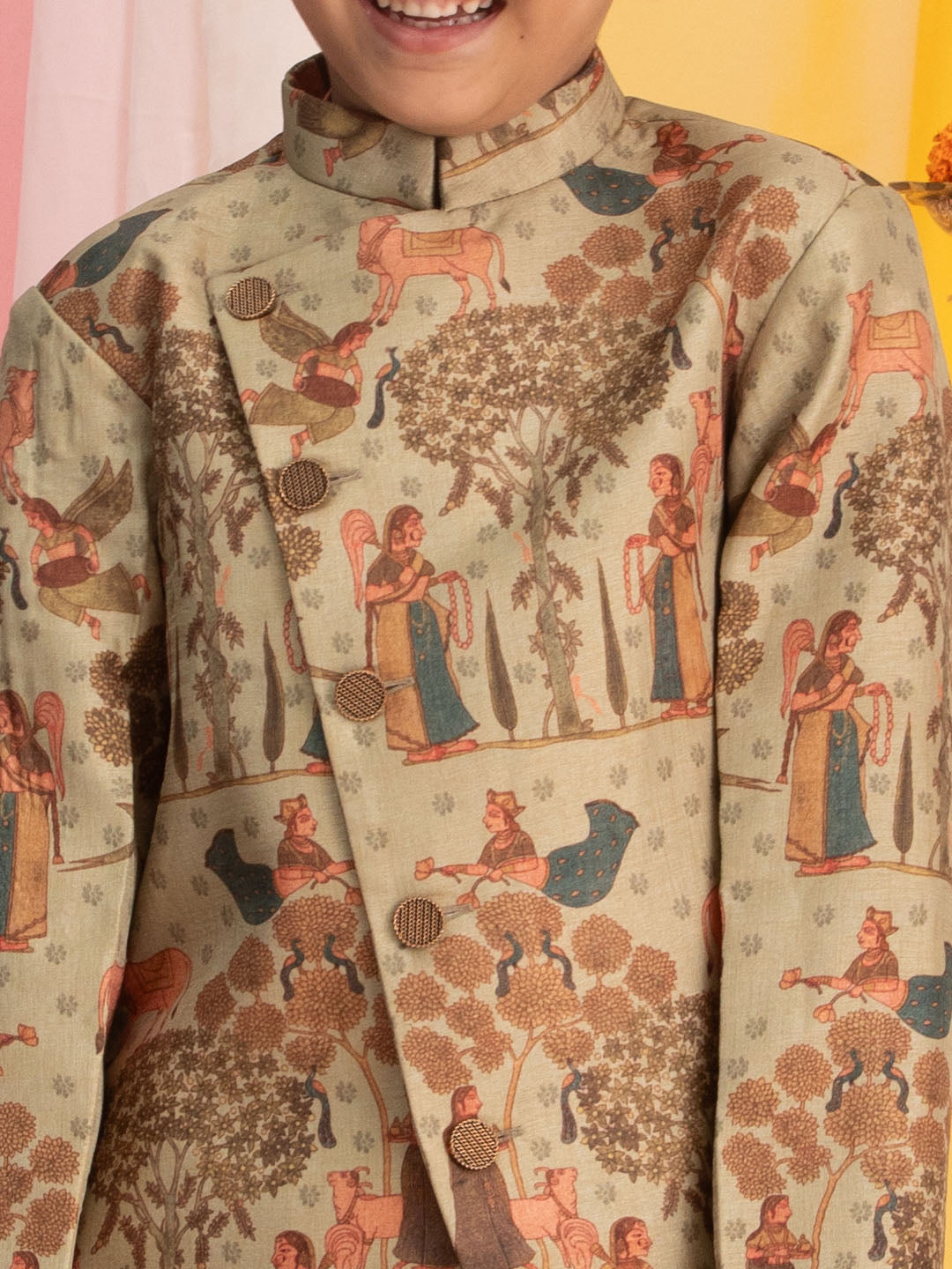 Green color printed asymmetric hemed Angrakha style indo has, full sleeves and mandarin collar. with pink color pleated kurta has mandarin collar, full sleeves and pocket with pyjama has an elasticated waistband.