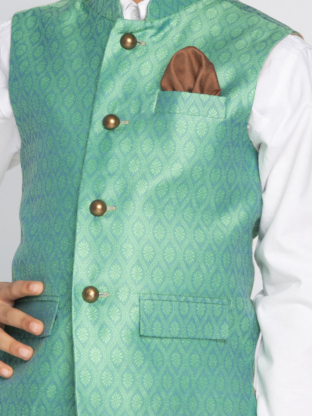 Green woven Nehru jacket, has a mandarin neck, a full button placket, sleeveless, straight hem, and one pocket with a pocket square.
