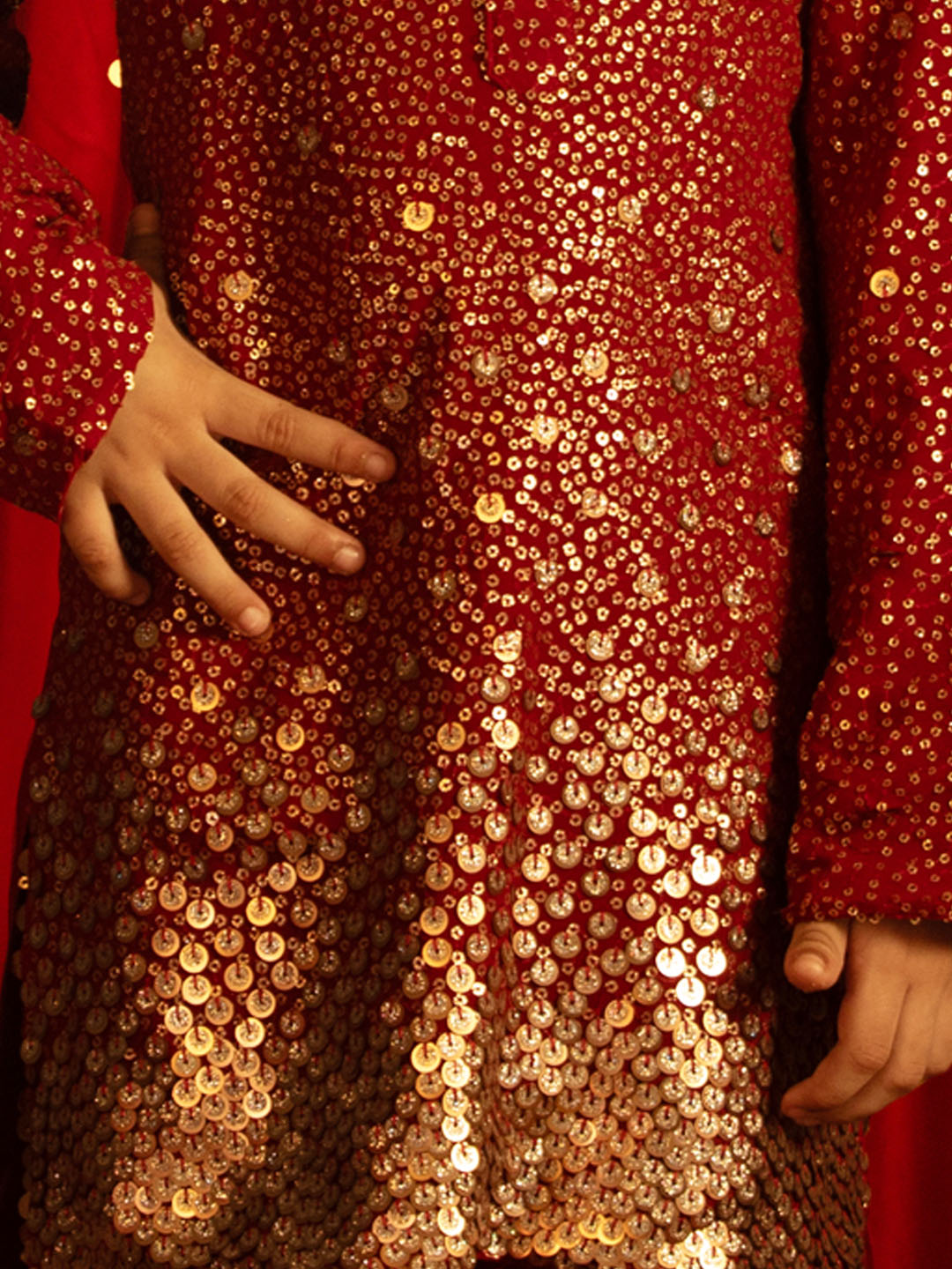 This kurta set has sequins and embroidery detailing in geometric patterns. It has full sleeves and mandarin neck. Comes with comfortable pyjamas. Perfect for any festive occasion.