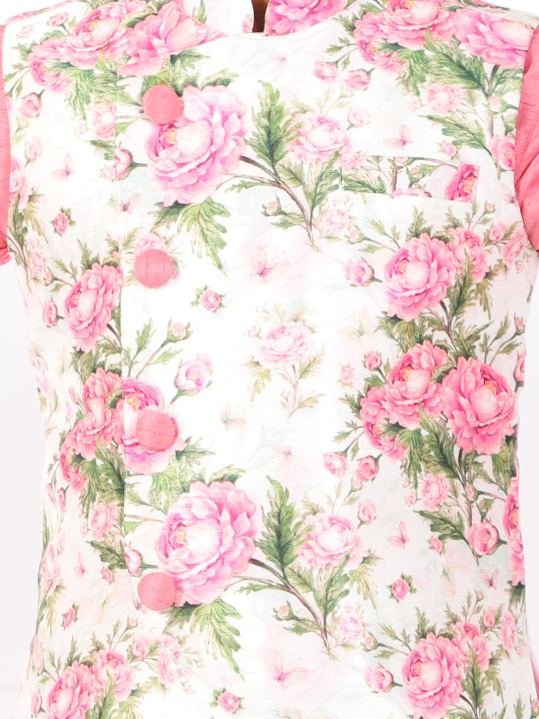 Multicolor-base-cream floral digitally printed angrakha pattern Nehru jacket, has a mandarin neck, a full button placket, sleeveless, straight hem, and one pocket.