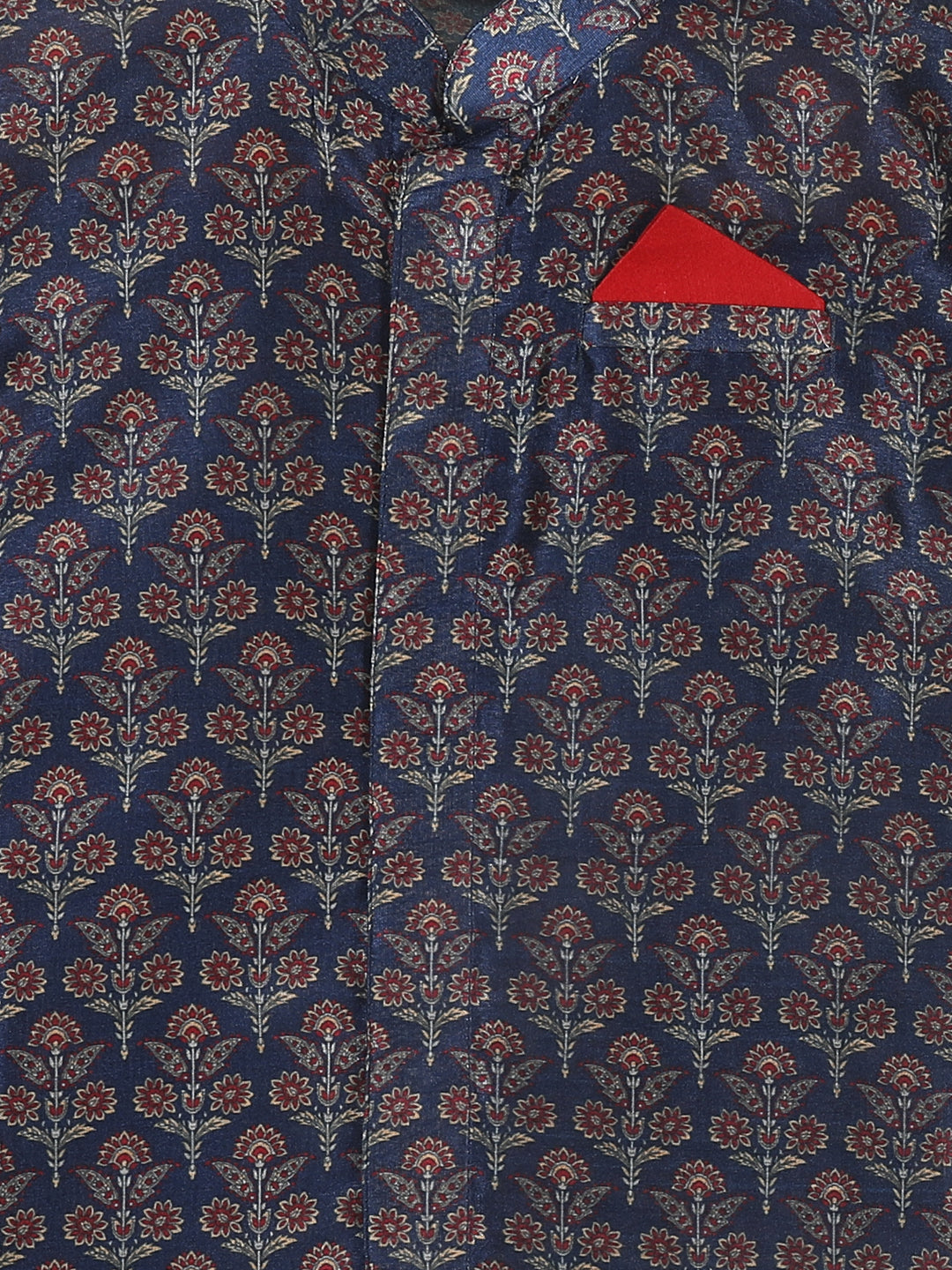Navy blue color floral printed kurta has A-line shape, regular style, band collar, long regular sleeves, 2 pockets, knee length with straight hem, silk blend machine weave fabric.