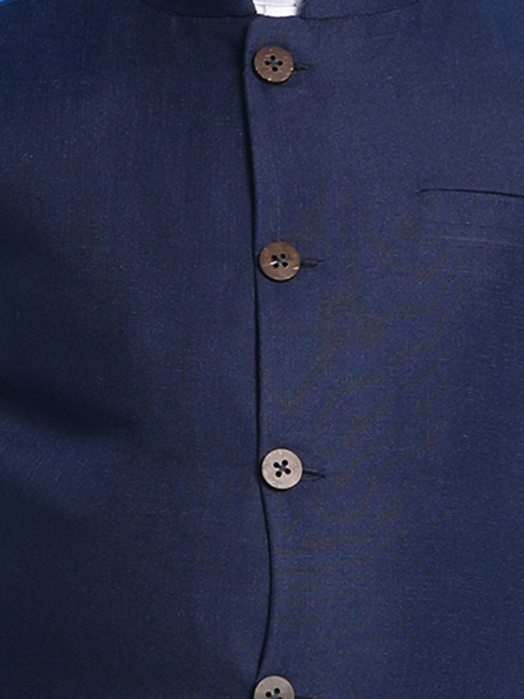 VASTRAMAY Boy's Navy Blue Solid Nehru Jacket With White Kurta Pyjama set