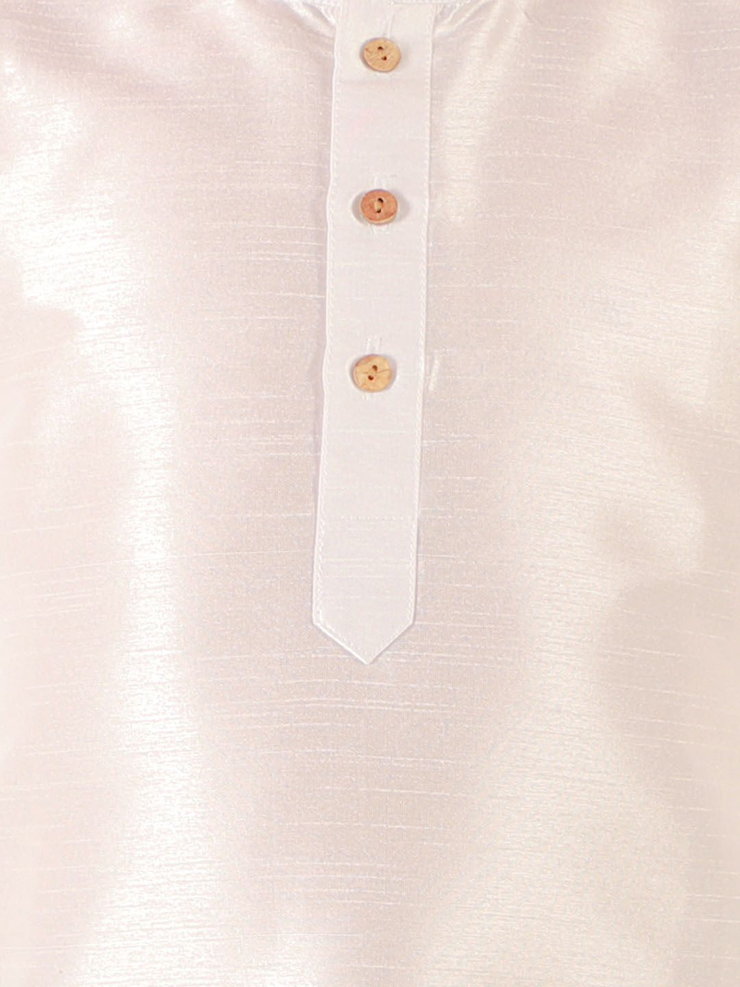 White straight above knee length kurta, has a mandarin collar, button placket with wooden button, long sleeves, curved hem, side slits