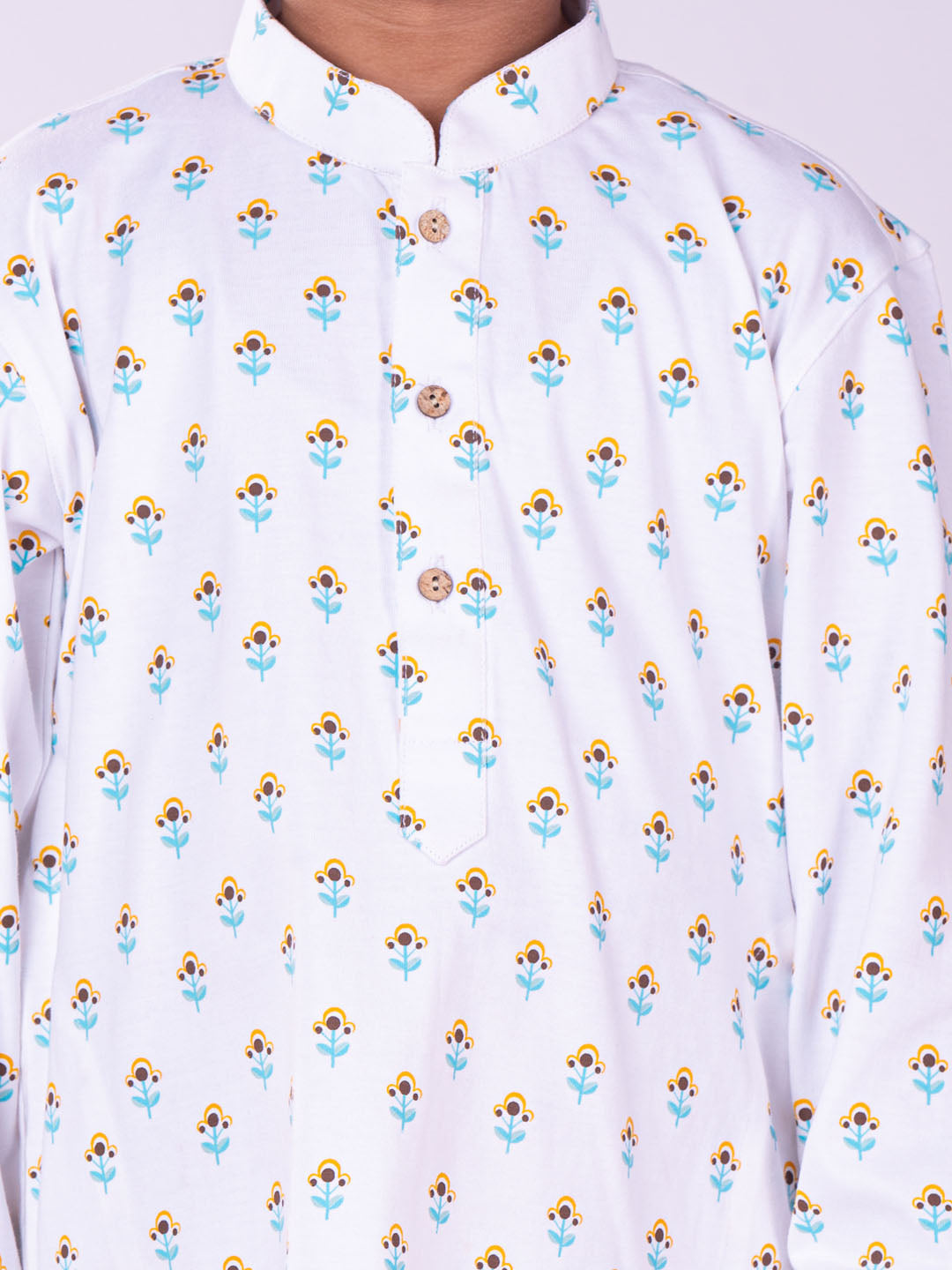 Vastramay present all-over printed kurta, has full sleeve, knee length and mandarin collar, button closure, straight hem and side slit, comes with white cotton comfortable pyjama set.