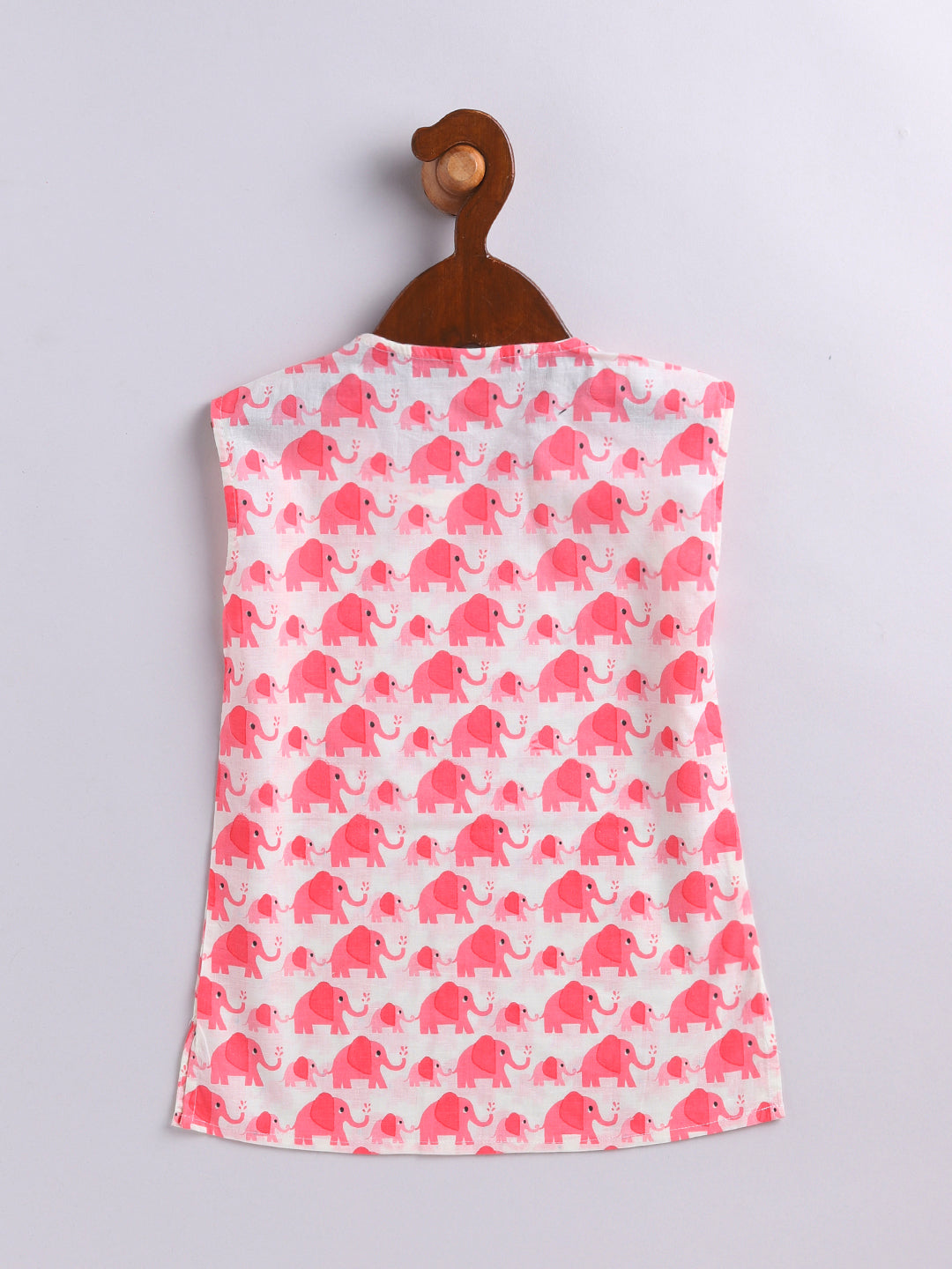 Cotton allover printed kurta with round neck, knee length and has sleeveless. Comes with a cotton pyjama with elasticated wasitband.