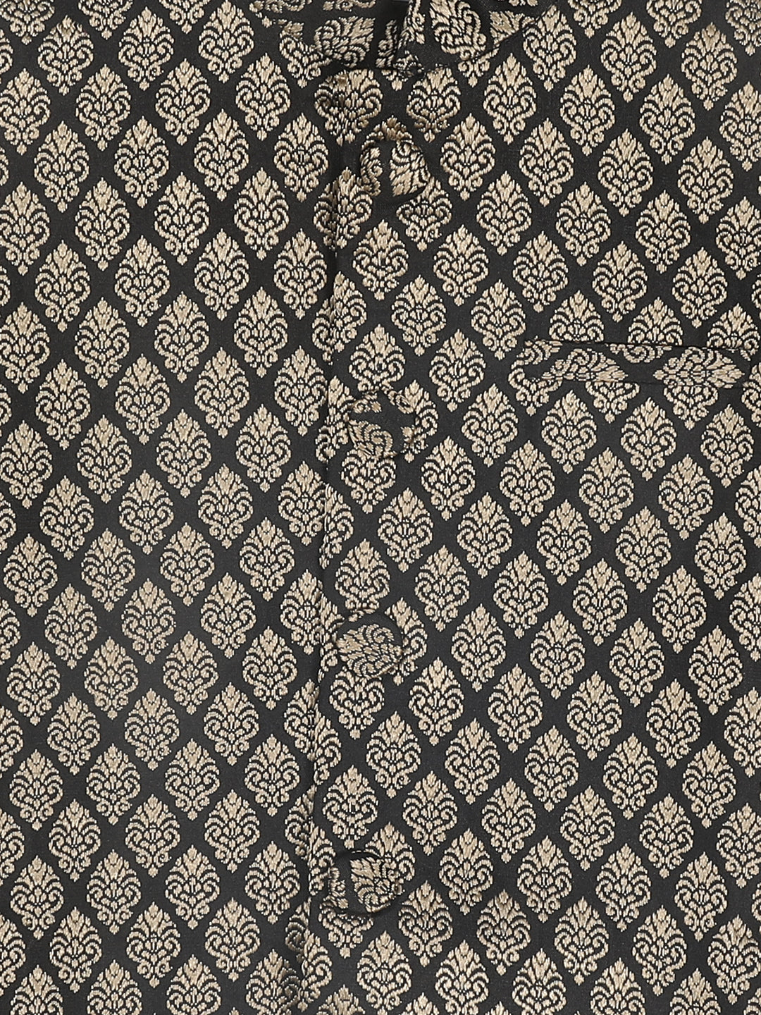 Black color woven-design slim fit Nehru jacket, has a mandarin neck, a full button placket, sleeveless, a straight hem and one pocket
