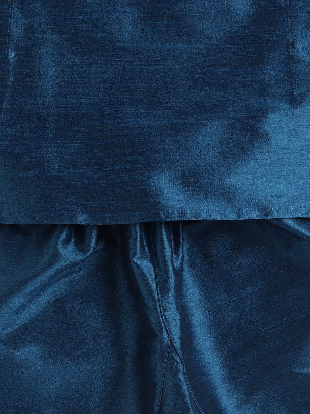 Turquoise blue banarasi silk with a slight cotton mix for a soft comfortable feel solid straight knee-length kurta, has a mandarin collar, button placket, long sleeves, straight hem