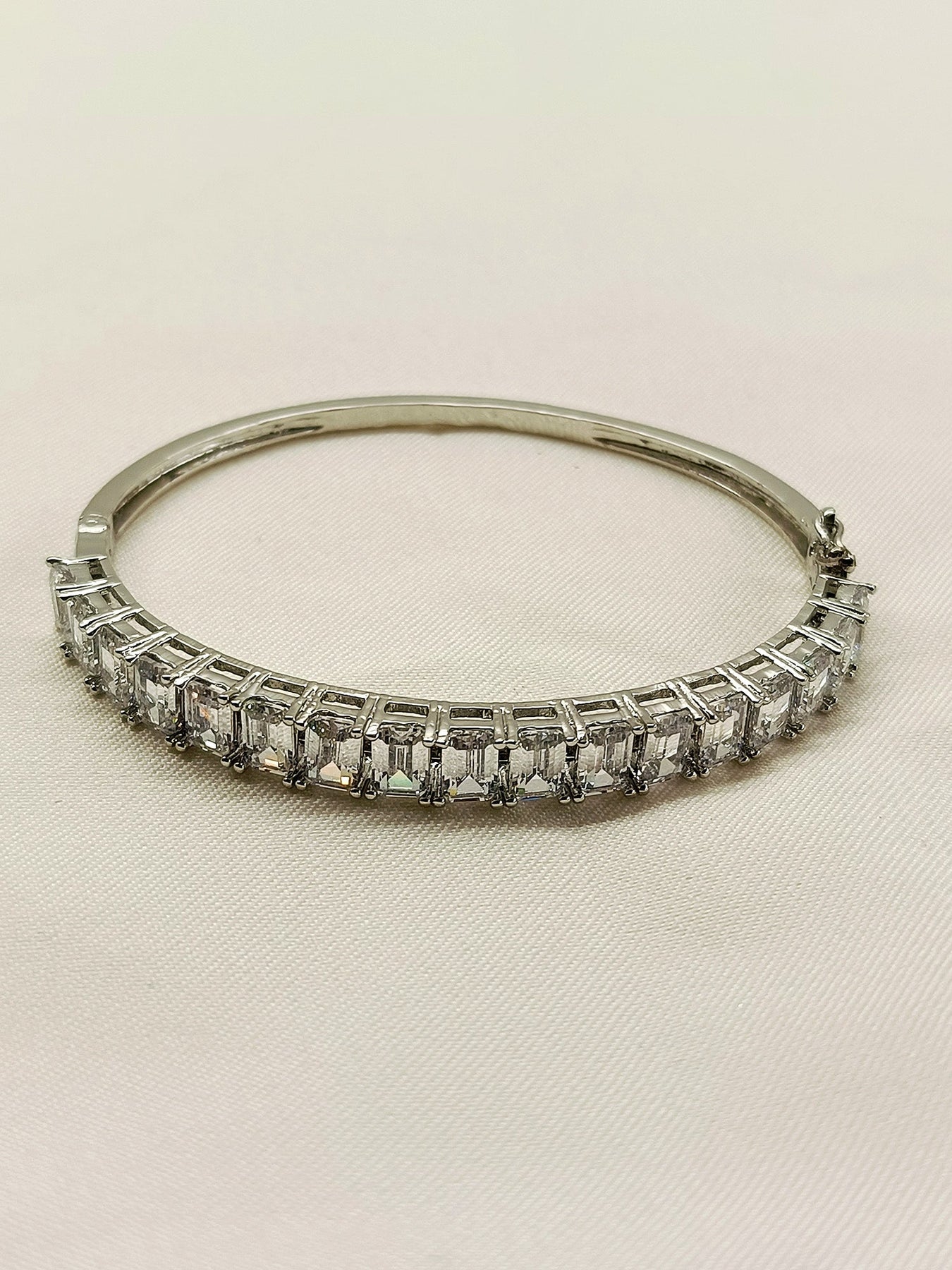 Expertly Crafted Openable American Diamond Bracelet Style And Plated In Silver Brass, Adds The Perfect Touch Of Elegance To Any Outfit. Perfect For Both Casual And Formal Occasions, This Flexible Bracelet Is A Must-have For Any Fashion-forward Individual. Upgrade Your Jewelry Collection Today With This Stunning Bracelet.