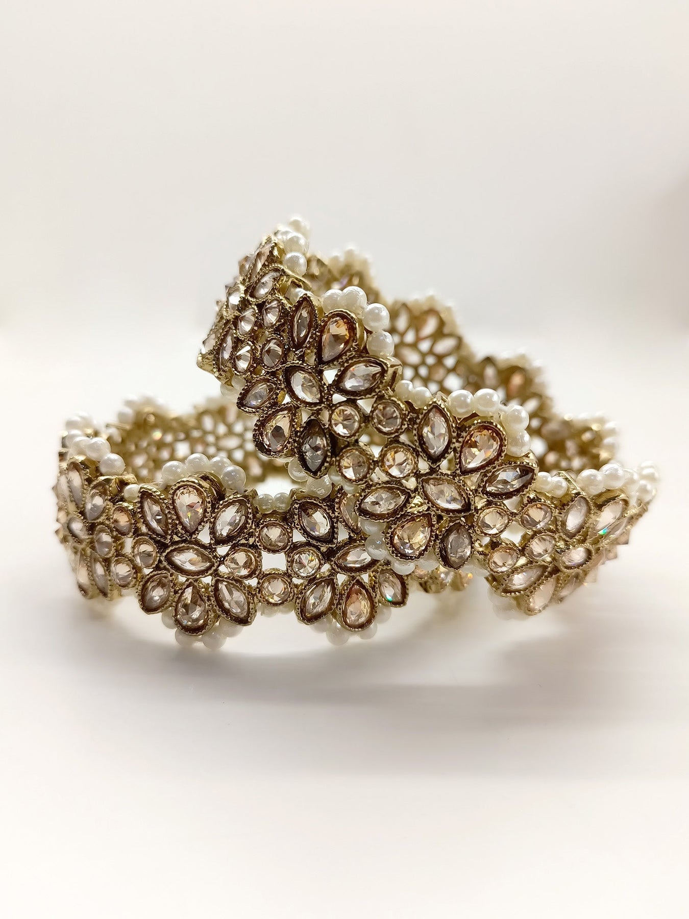 Elevate Your Look With These Exquisite Copper Polki Bangles. Crafted From Antique Gold Plated Brass, They Feature A Traditional Design Enhanced By Sparkling Copper Stones And Delicate Pearl Detailing. Add A Touch Of Elegance To Your Wardrobe.