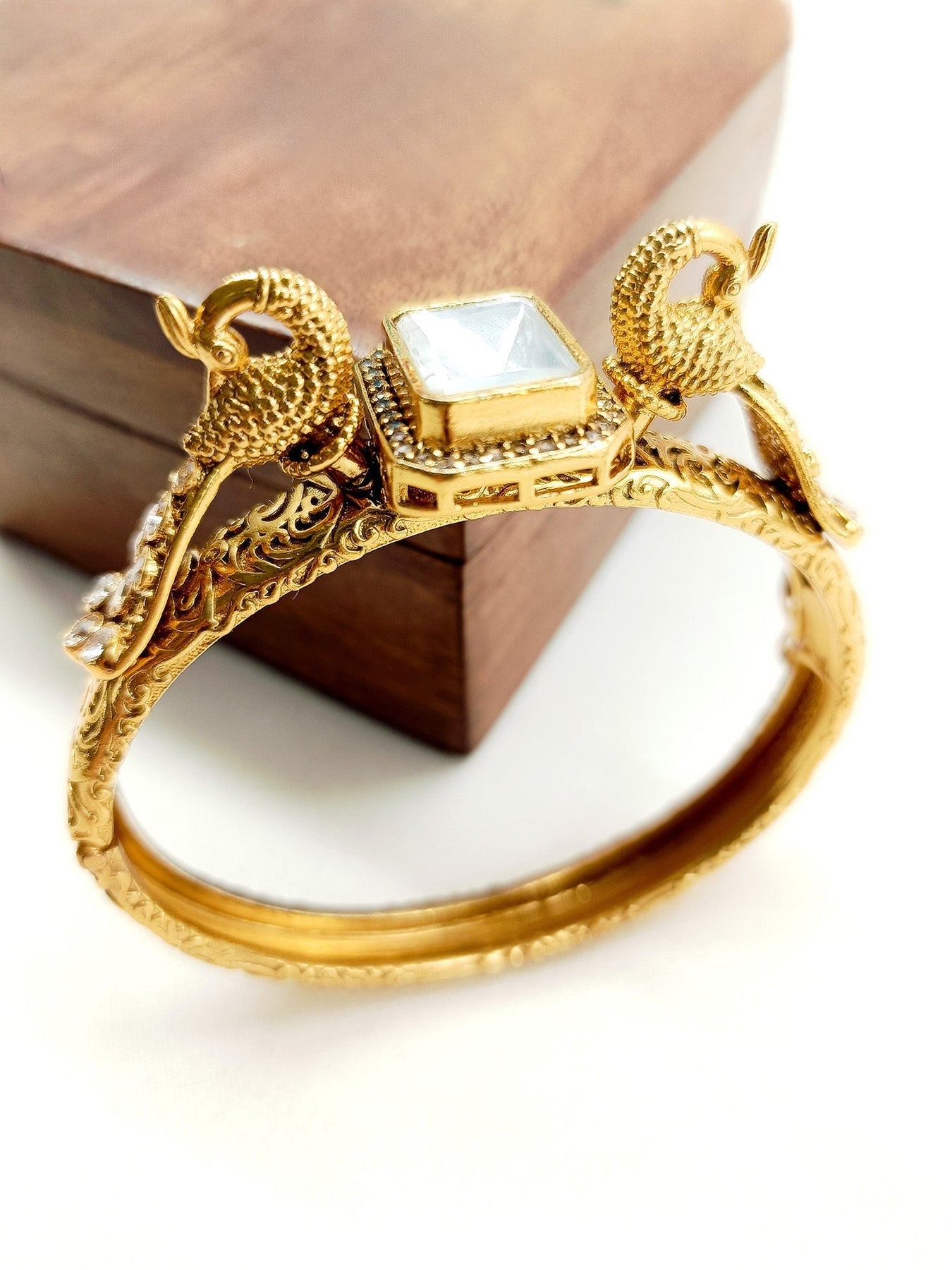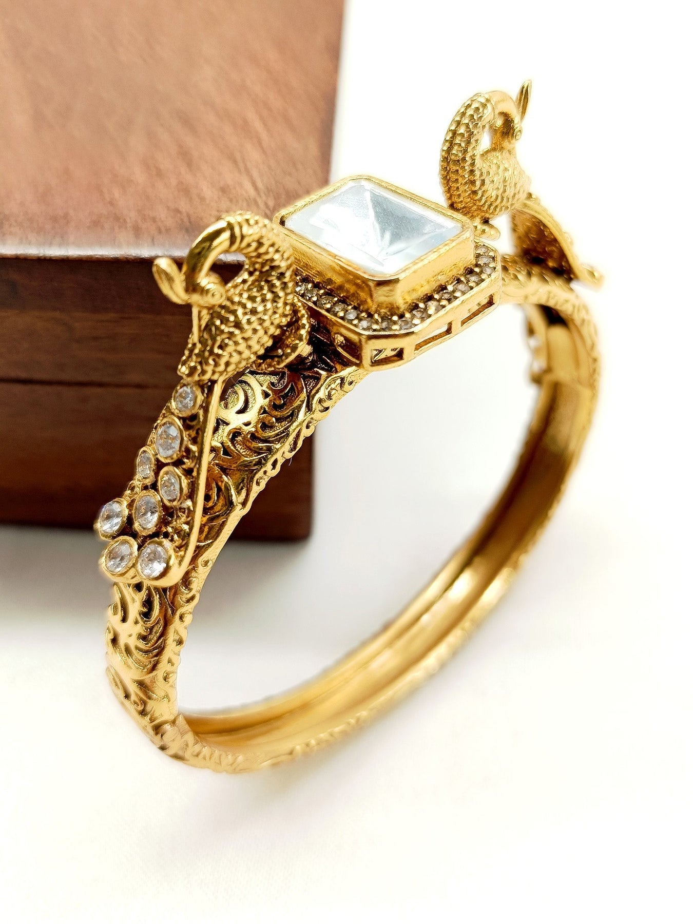 This Kundan Bangle Is Perfect For Any Occasion. Made Of Premium Gold Plating And Kundan, It Is Durable And Visually Stunning. The Intricate Detailing And Craftsmanship Of These Pieces Make A Beautiful Addition To Any Jewelry Collection.