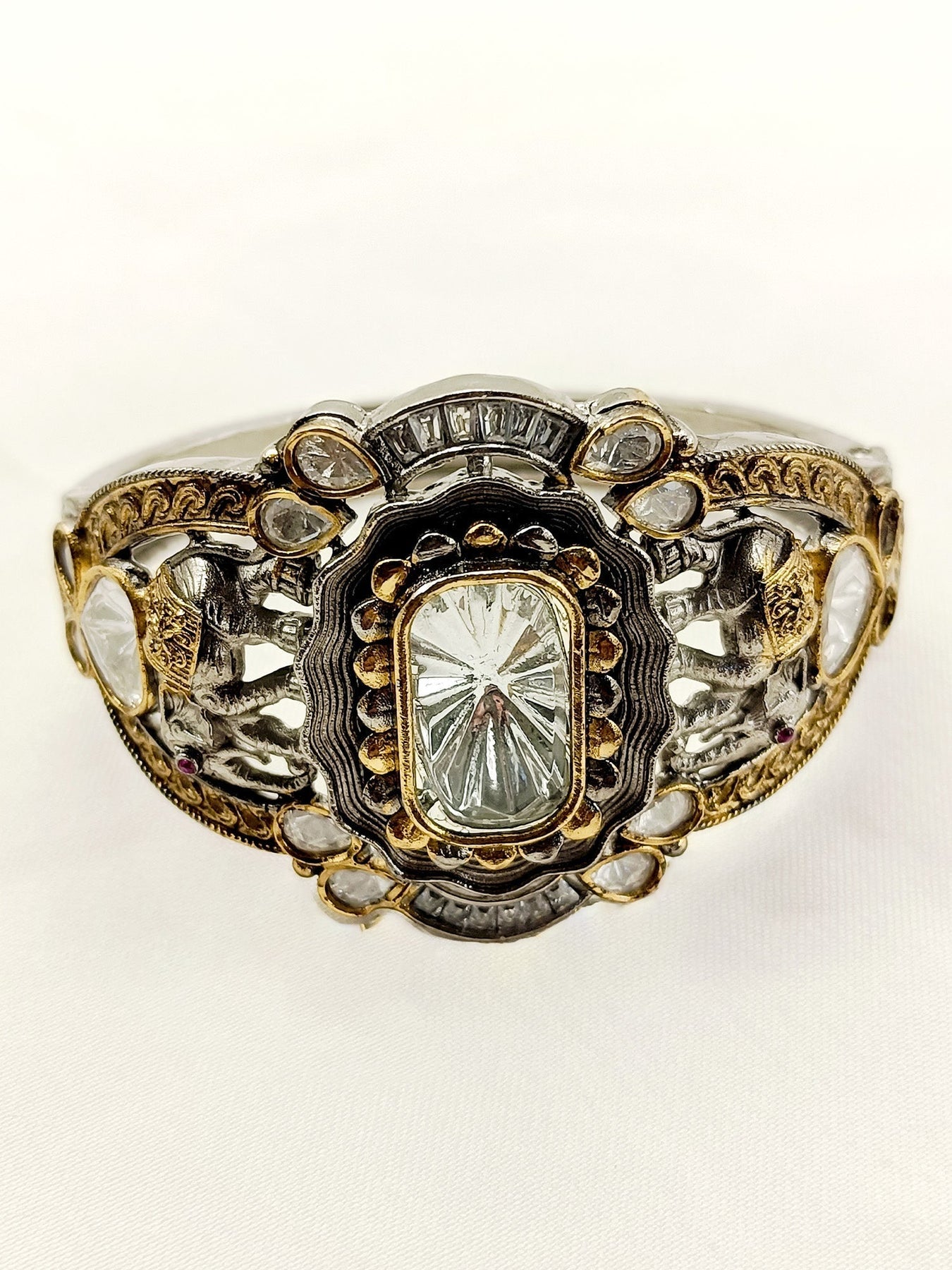 Expertly Crafted With An Elegant And Openable Design, The Victorian Kada Is A Timeless Piece That Exudes Luxury. Adorned With Elephant Motifs American Diamonds And Kundan Settings, This Silver Plated Brass Metal Kada Adds A Touch Of Glamour To Any Outfit. Elevate Your Style With This Statement Accessory.