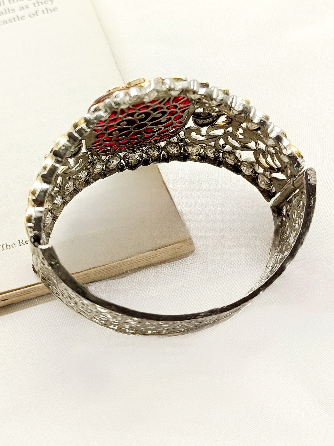 Expertly Crafted With An Elegant And Openable Design, The Victorian Kada Is A Timeless Piece That Exudes Luxury. Adorned With Kundan Stones, This Silver Plated Brass Metal Kada Adds A Touch Of Glamour To Any Outfit. Elevate Your Style With This Statement Accessory.