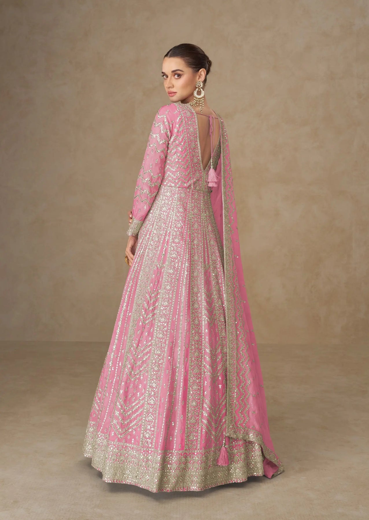 This daisy pink chinon silk gown is beautifully adorned with delicate thread and sequins embroidery, offering a soft and graceful look. Paired with a matching dupatta, it’s perfect for festive and special occasions.