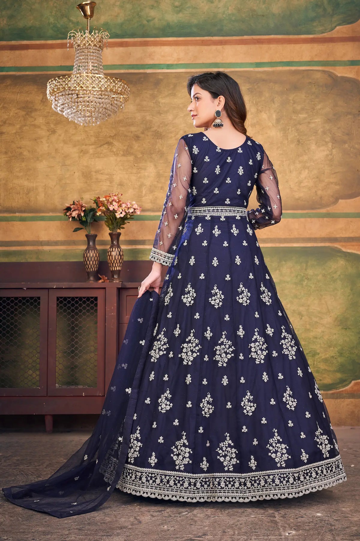 Navy Blue Net Gown With Zari & Thread Embroidery Work