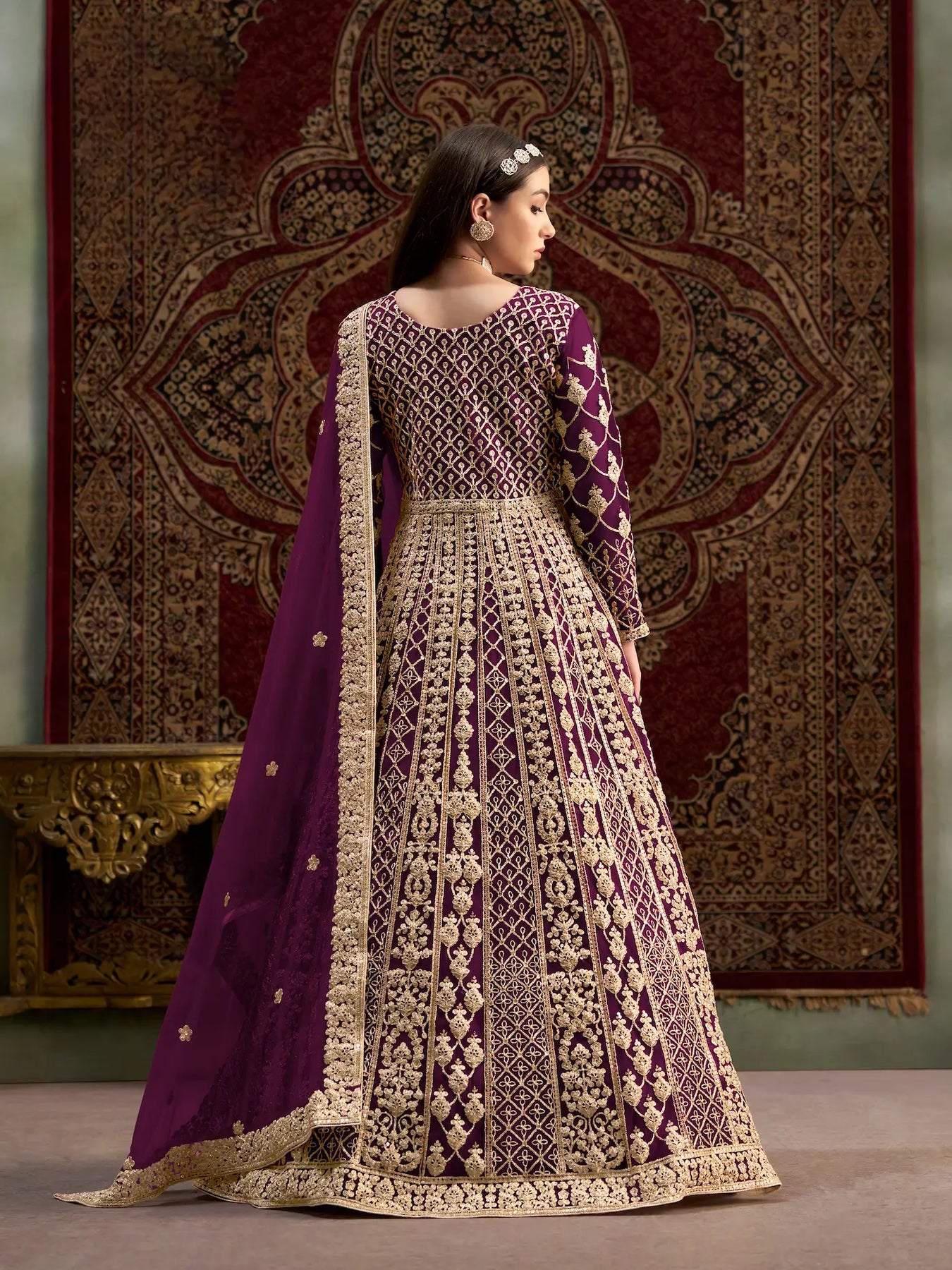 Wine Net Gown With Sequence & Zari Embroidery Work