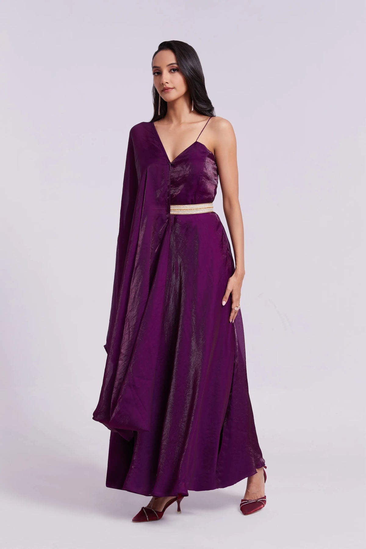 Bloom in style With our White printed Wine Pure Organza Gown designed to capture the essence of spring. Its elegant fit and vibrant floral pattern make it a perfect choice for both casual and formal occasions.