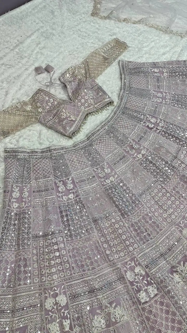 Step into ethereal elegance with this exquisite Net lehenga, featuring intricate sequence and silk thread work that exudes a regal charm. Designed with a 3.25-meter flair, this lehenga creates a dreamy, flowy silhouette, perfect for making a grand entrance. The matching Net blouse is adorned with the same sequence and silk thread embroidery, offering a seamless blend of tradition and modern sophistication. Completing the look is a delicately crafted Net dupatta, enhanced with silk thread and sequence work, adding a touch of grace and refinement. This ensemble is an impeccable choice for weddings, receptions, and festive celebrations.