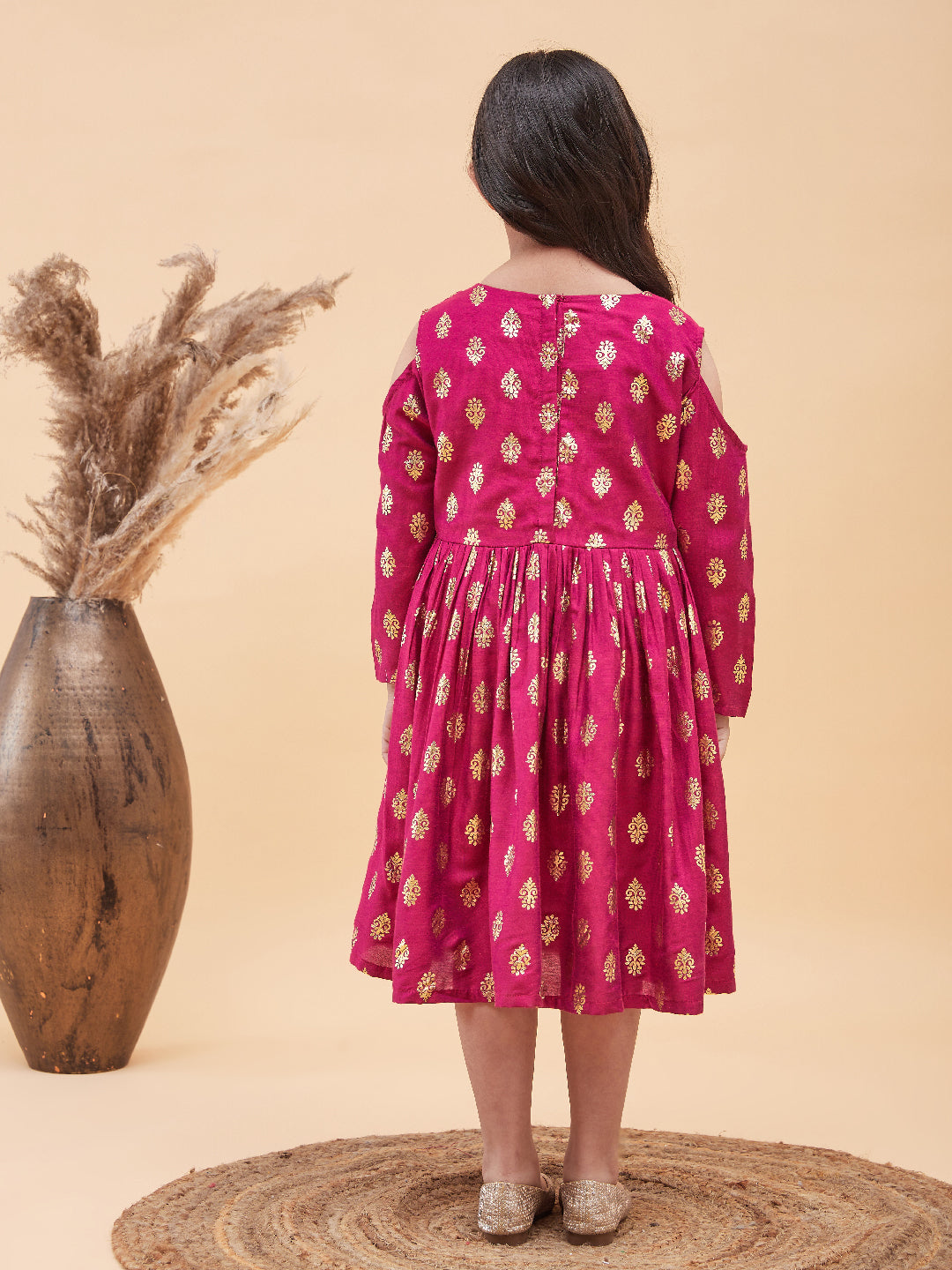 Girls's dark pink color viscose foil printed pleated kurti has full sleeves, round neck, cold shoulder round hem and hook closure.